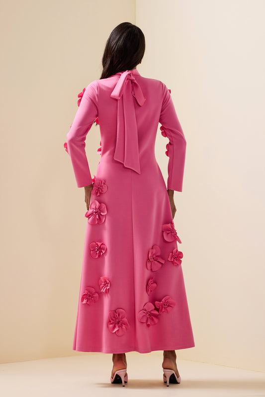 3D Flower Stand Collar Long Sleeve Midi Dress