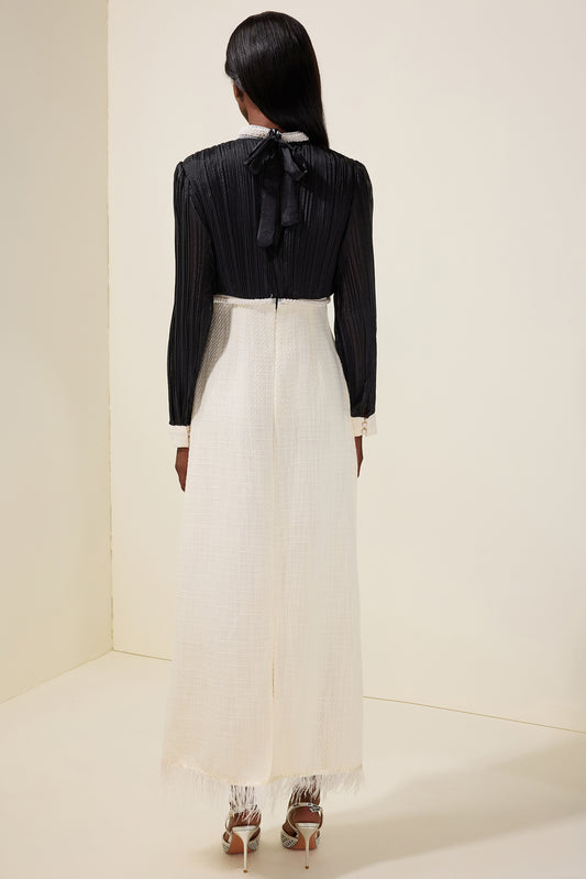 Tweed Contrast Color Rhinestone Feather Midi Dress