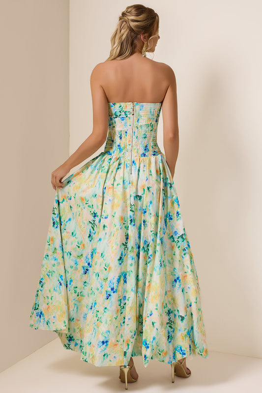 V-Neck Cut-Out Pleated Split Maxi Dress Green