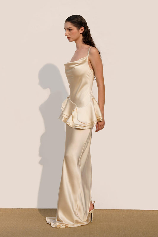 Satin Swing Collar Ruffle Maxi Dress