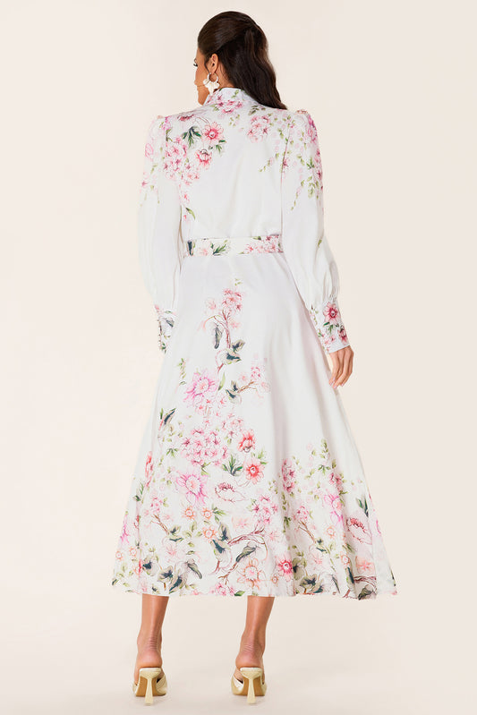 3D Flower Stand Collar Long Sleeve Midi Dress