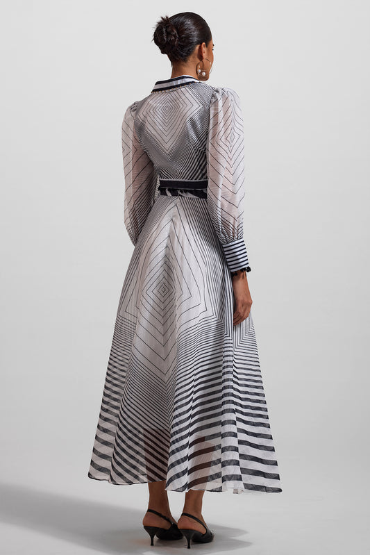 Stripe Lace Up Long Sleeve Top & Mid Waist Pleat Midi Skirt Set