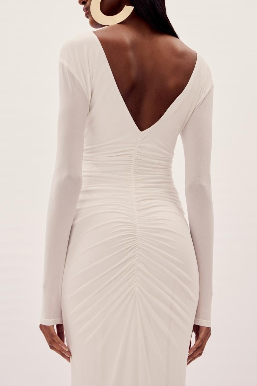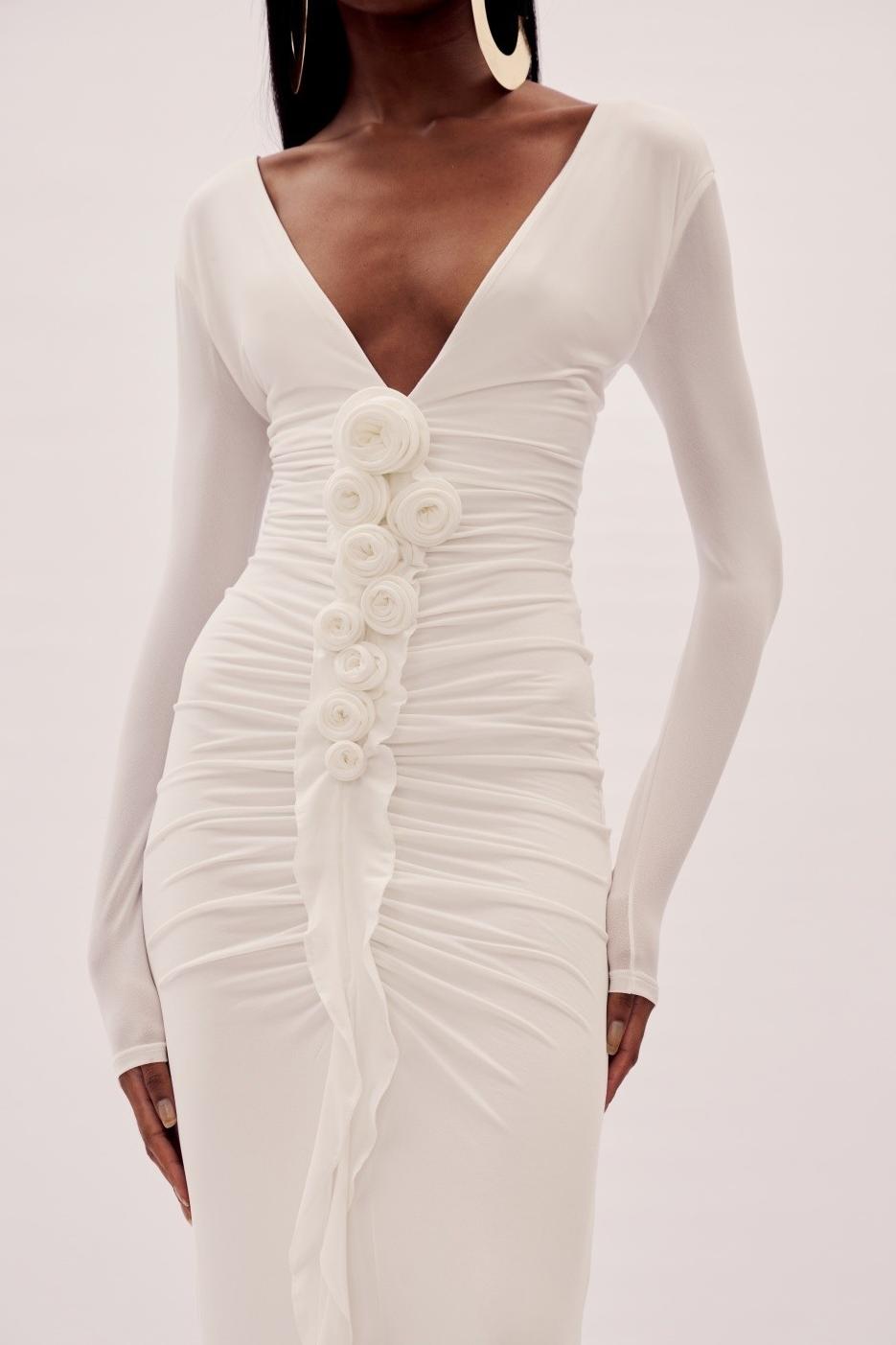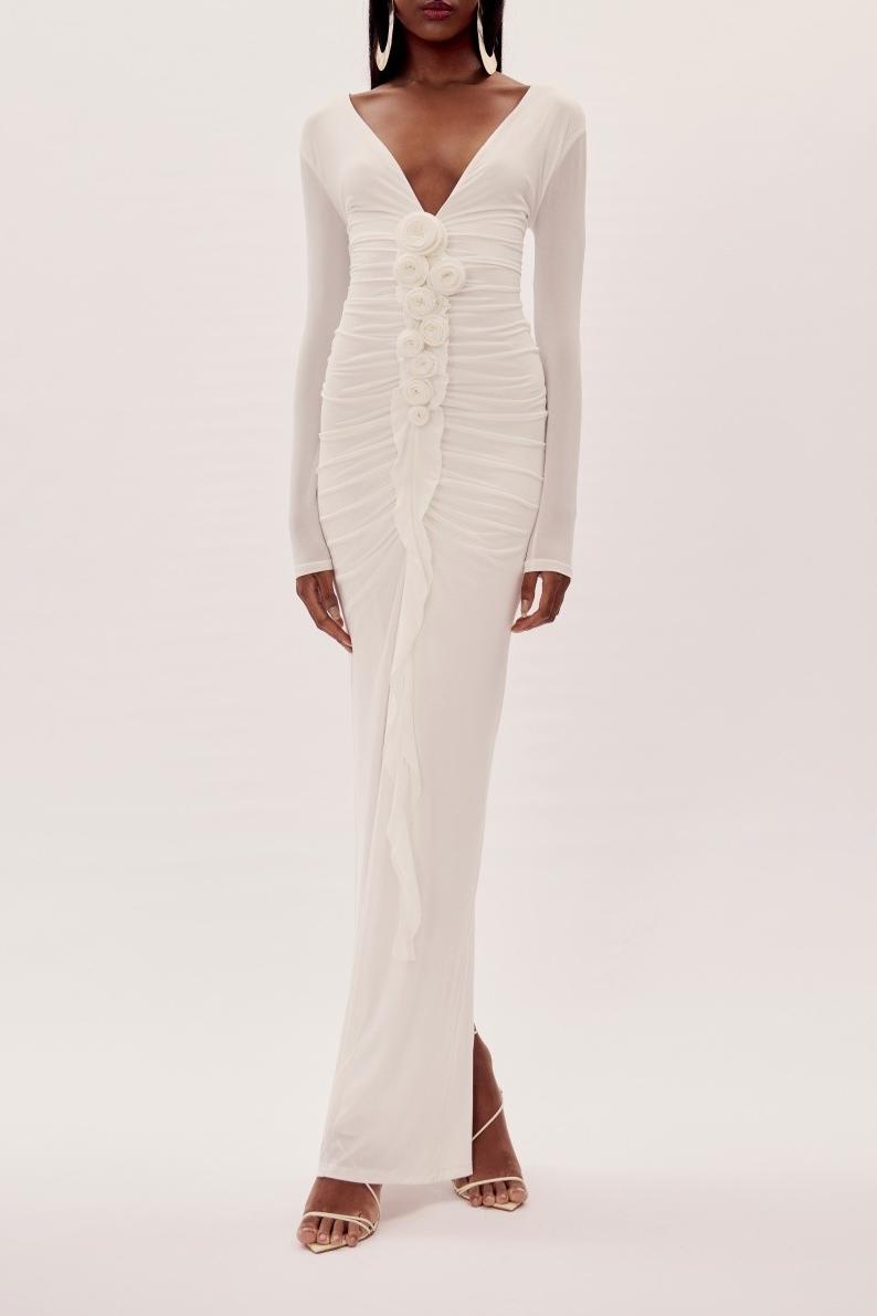 - Long sleeve, solid color, white, 3D flower, gathering, V-neck, maxi dress