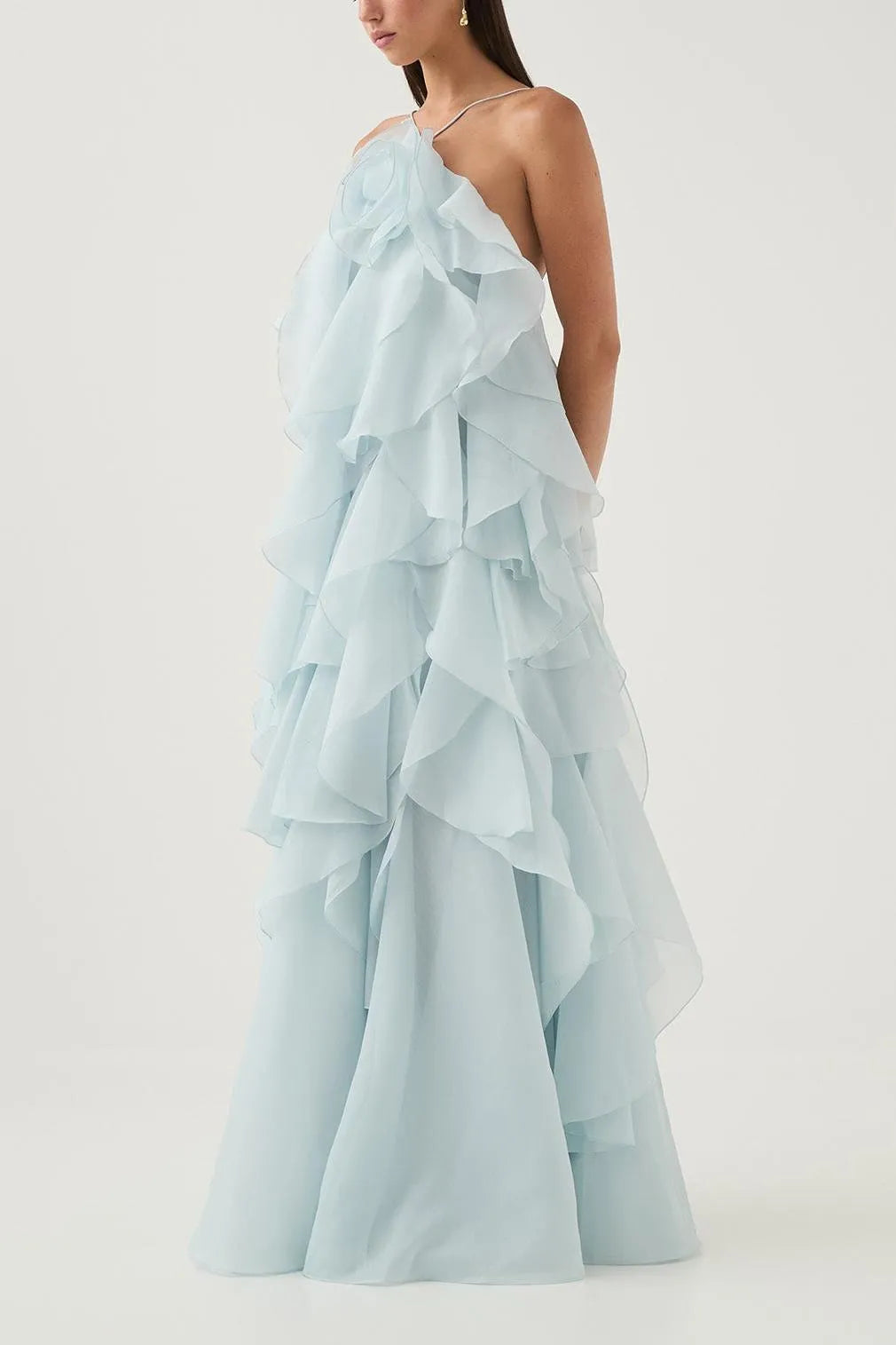 3D Flower Halter Neck Frill Maxi Dress