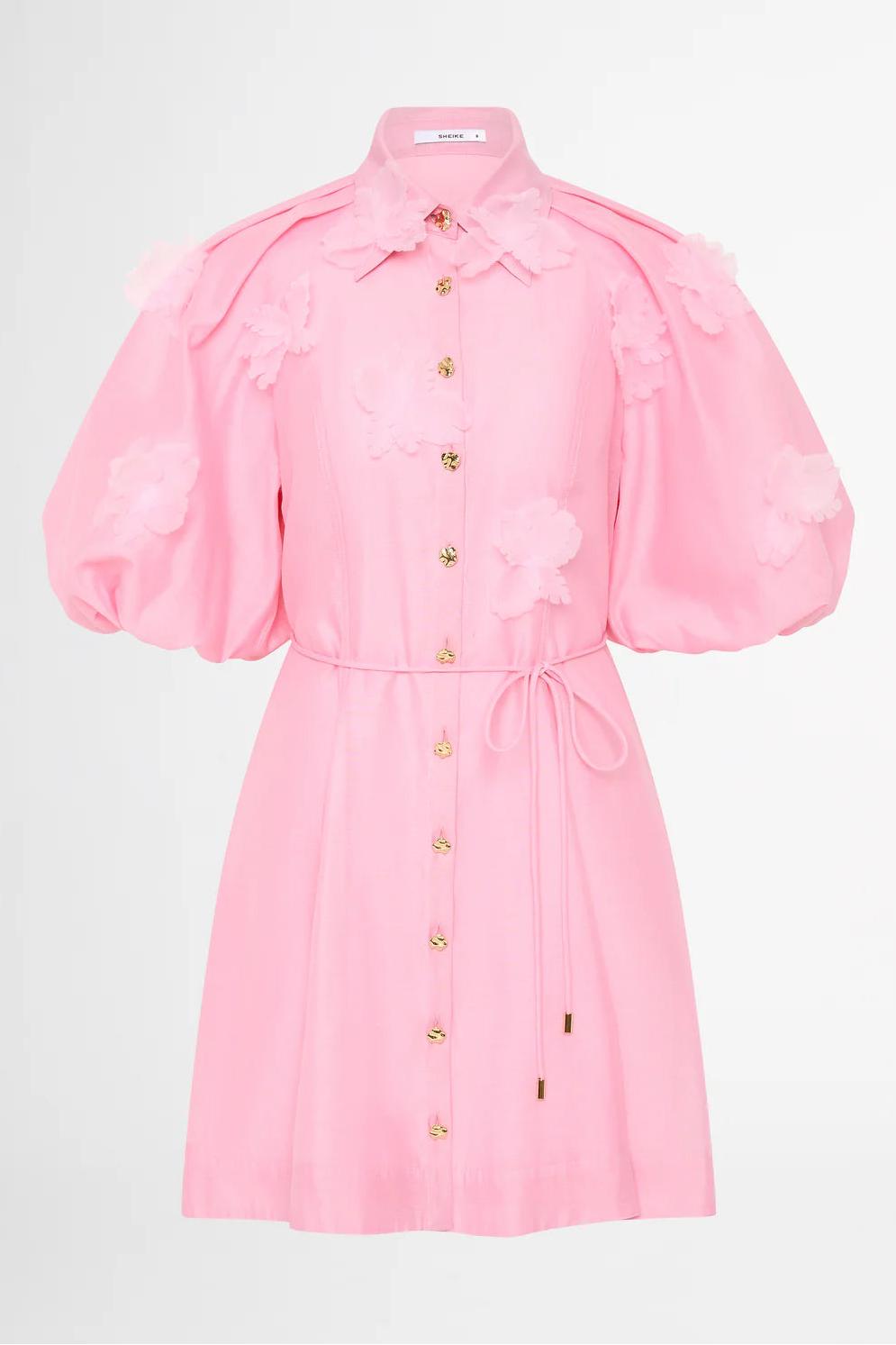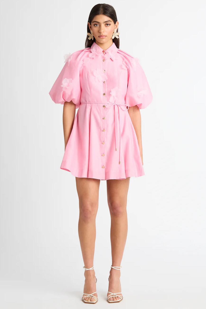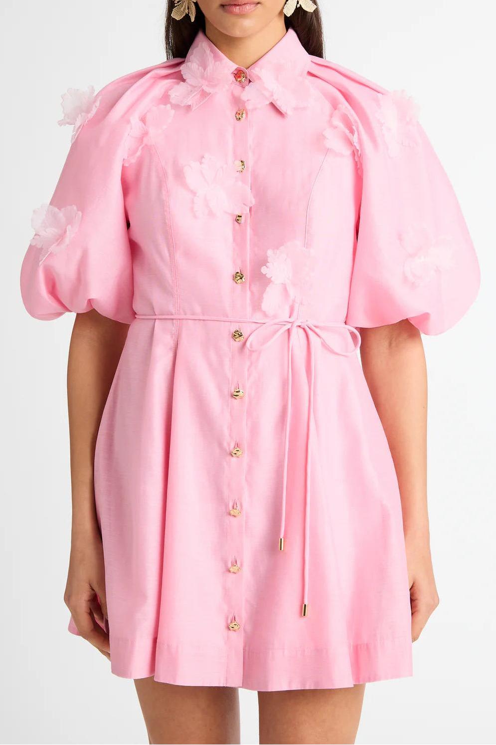 - Short sleeves, 3D flower, puff sleeves, metal button, solid color, pink, mini dress