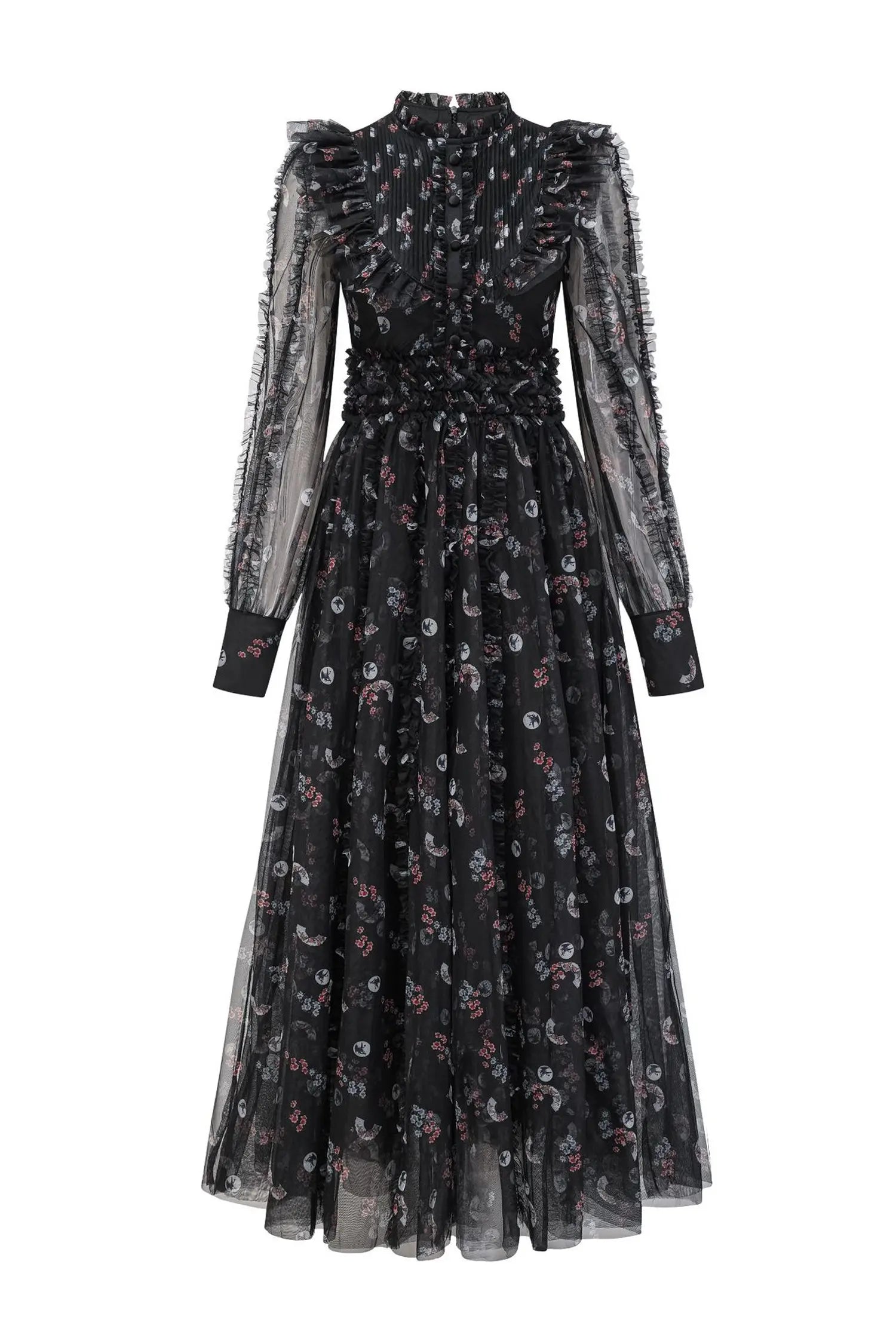 Elevate your style with the Beryl Black Floral Long Sleeve Dress. Designed with a gentle breeze of femininity, this dress features a high-waisted cut and a Peter Pan collar adorned with delicate frills. Perfect for beach getaways or birthday celebrations, this long dress exudes a graceful charm that will turn heads wherever you go.