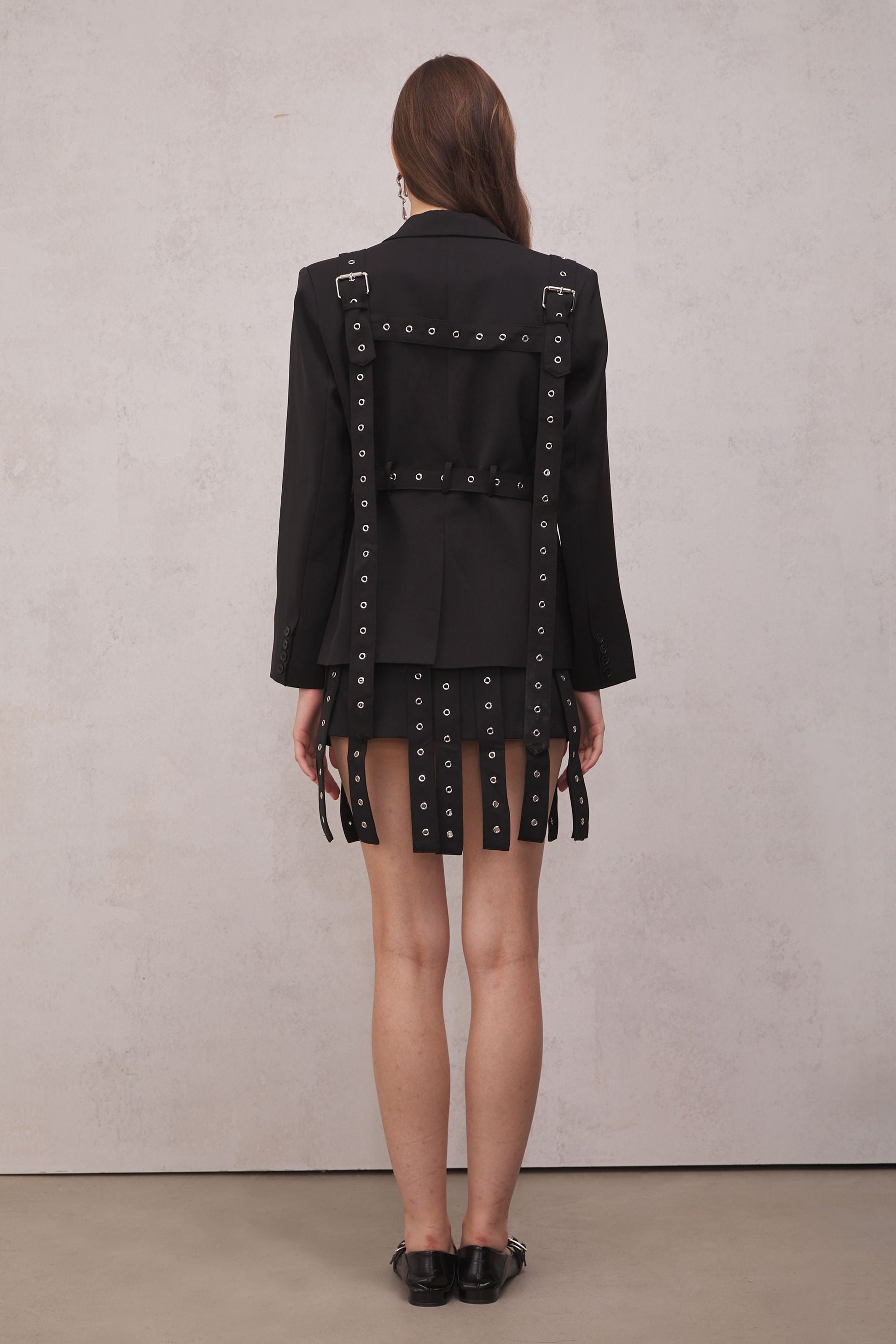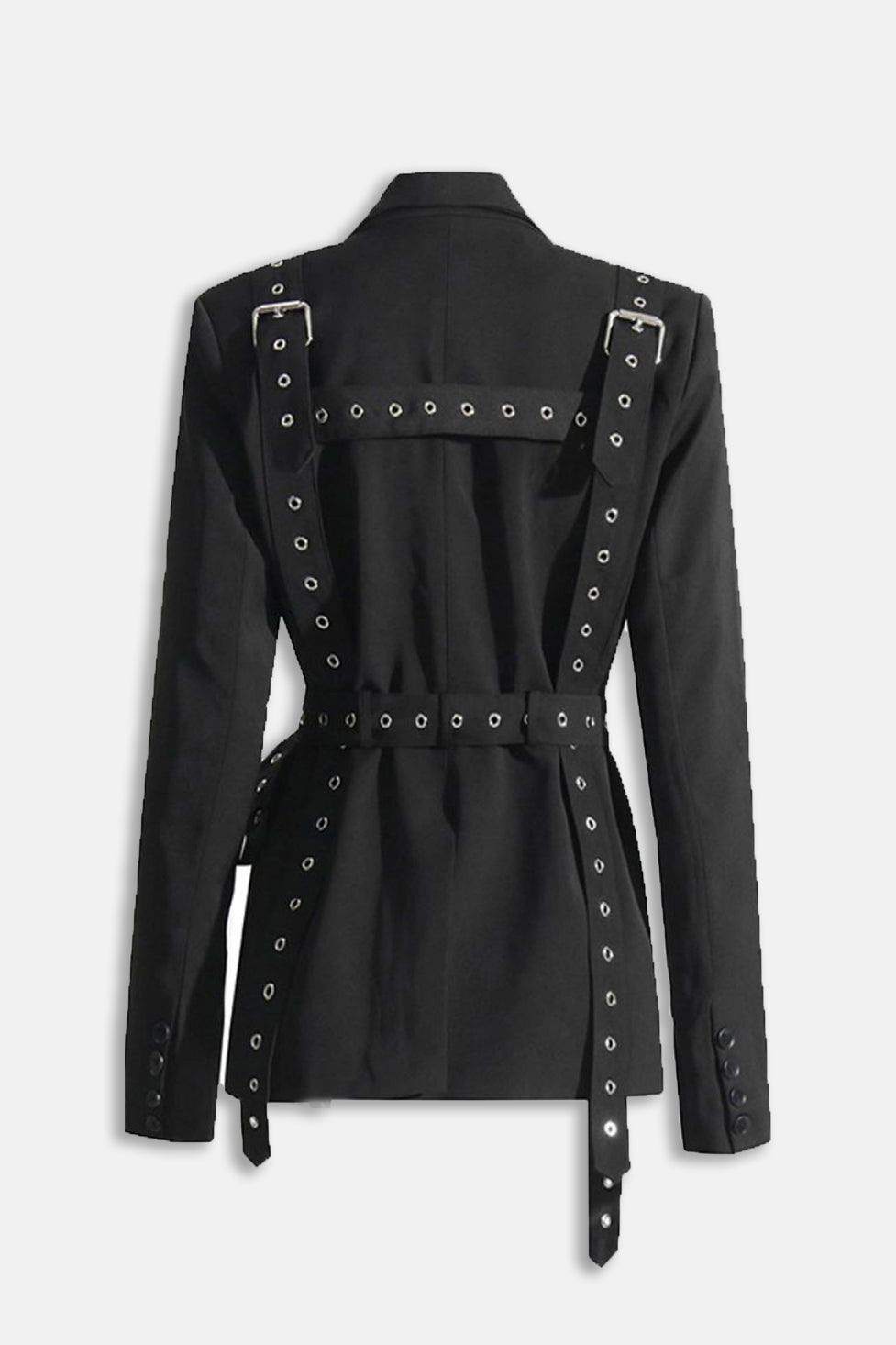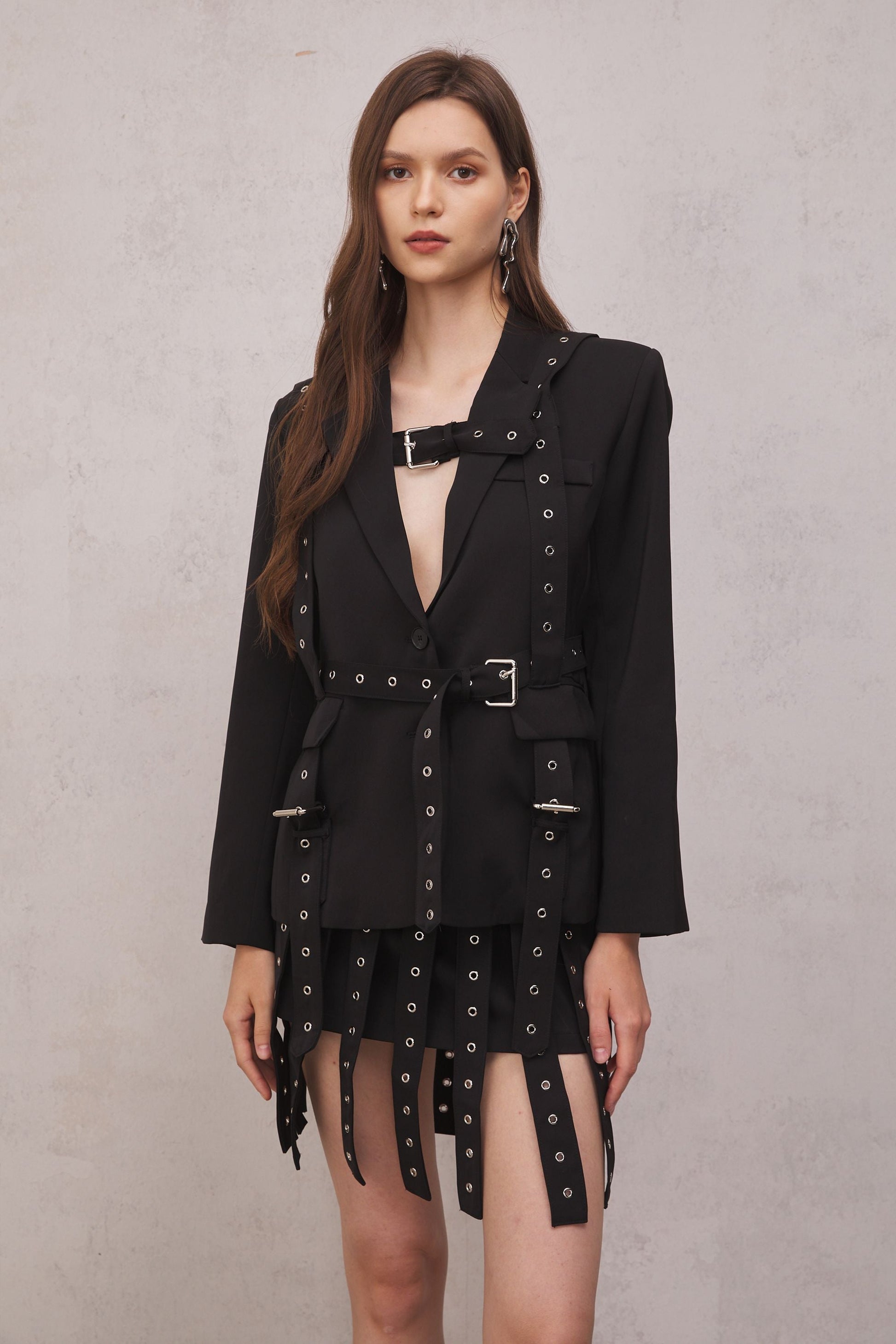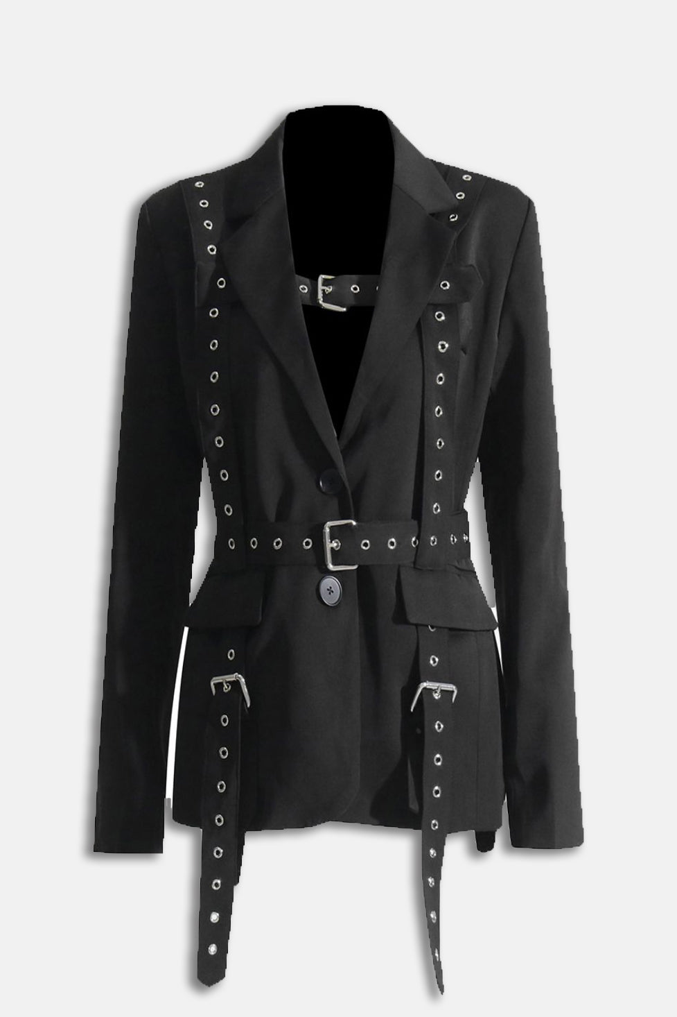 Introducing the sophisticated and versatile Blake Belt Embellished Blazer. This black blazer features a unique belt embellishment that adds a touch of elegance and style. Perfect for any occasion, this blazer is a must-have for fashion-forward individuals looking to elevate their wardrobe.