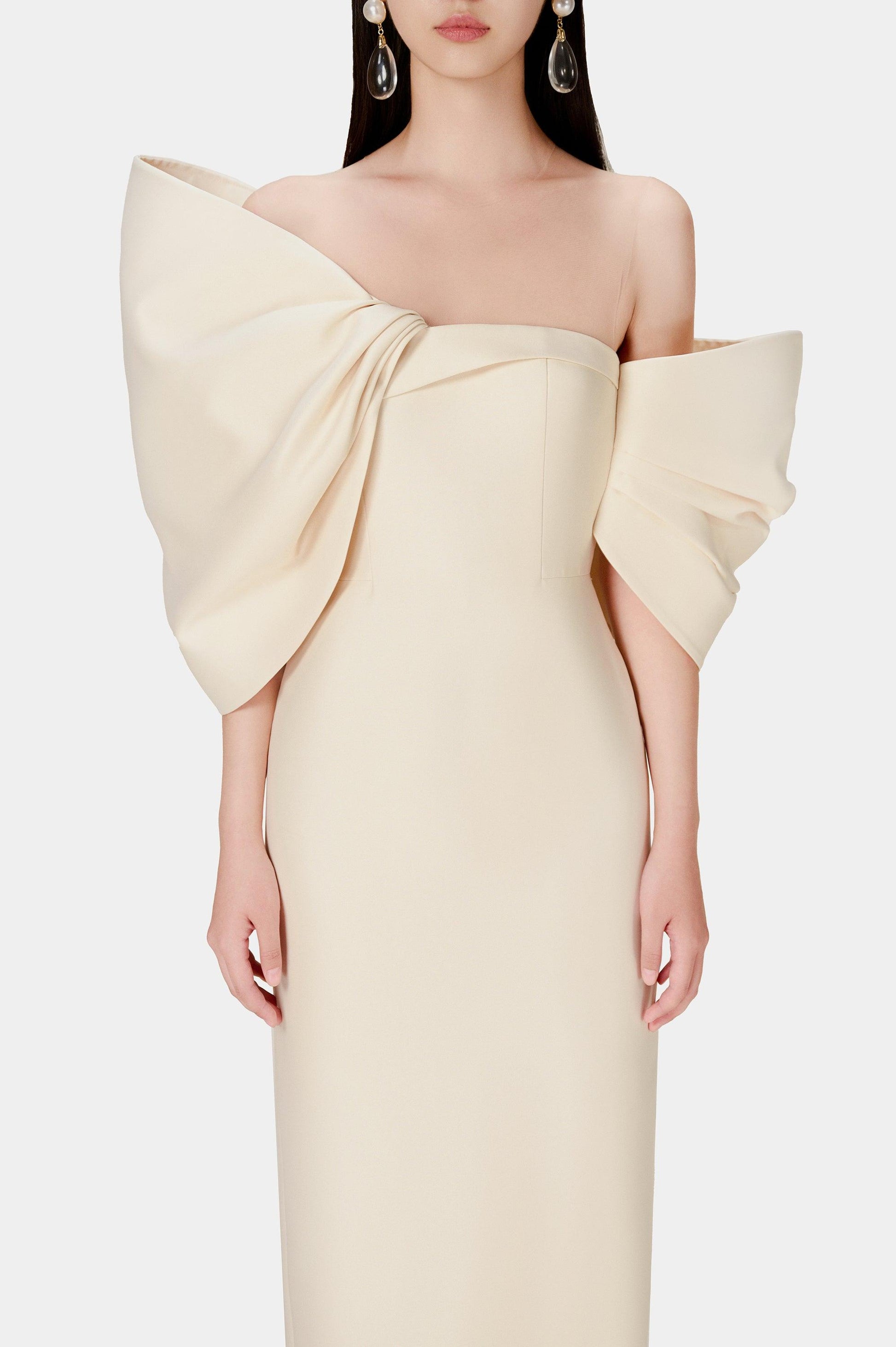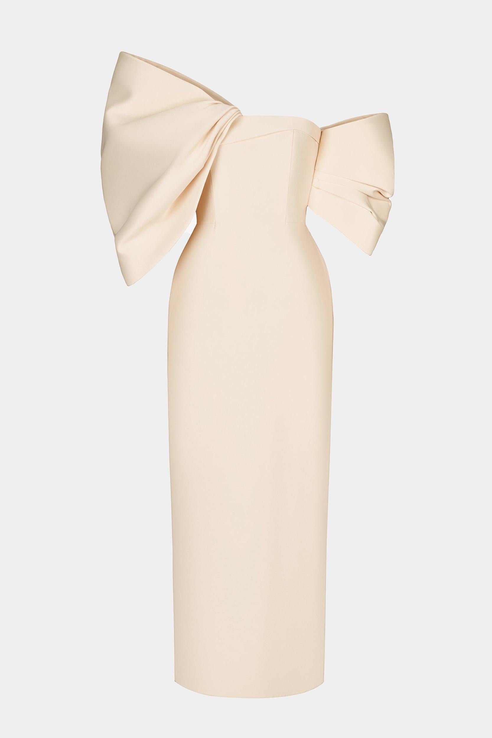 - Bow, beige, off-shoulder, asymmetrical, midi dress