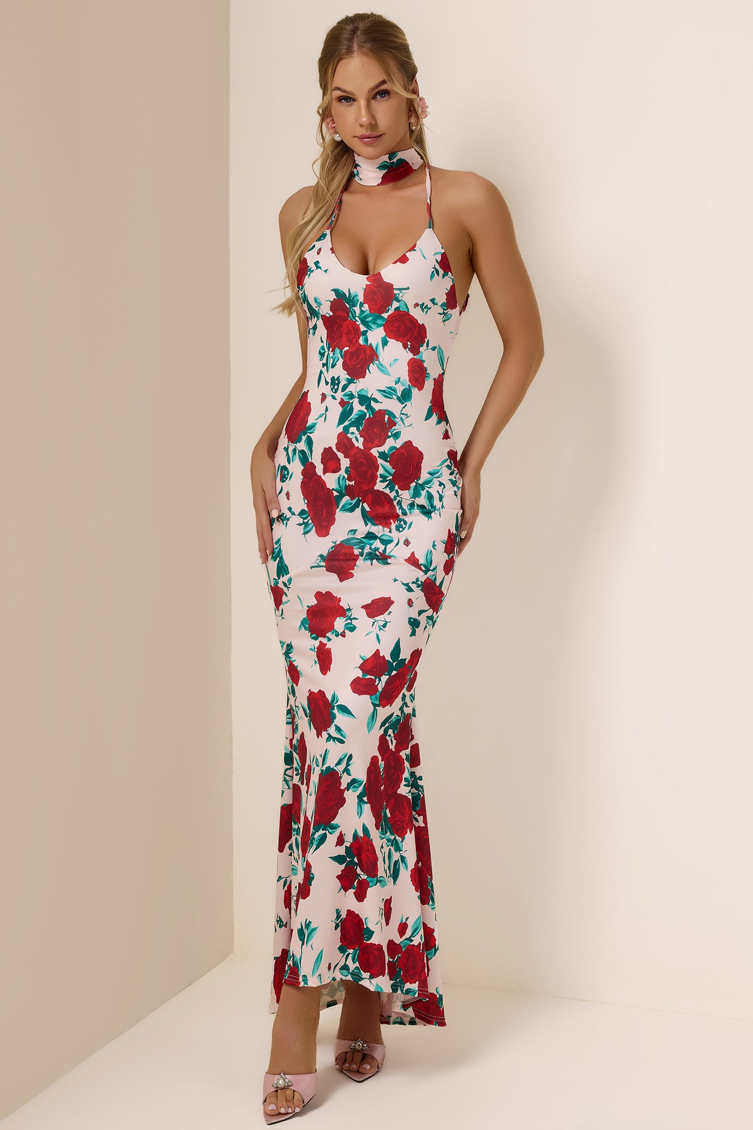 - Sleeveless, red, plunge, maxi dress, chiffon