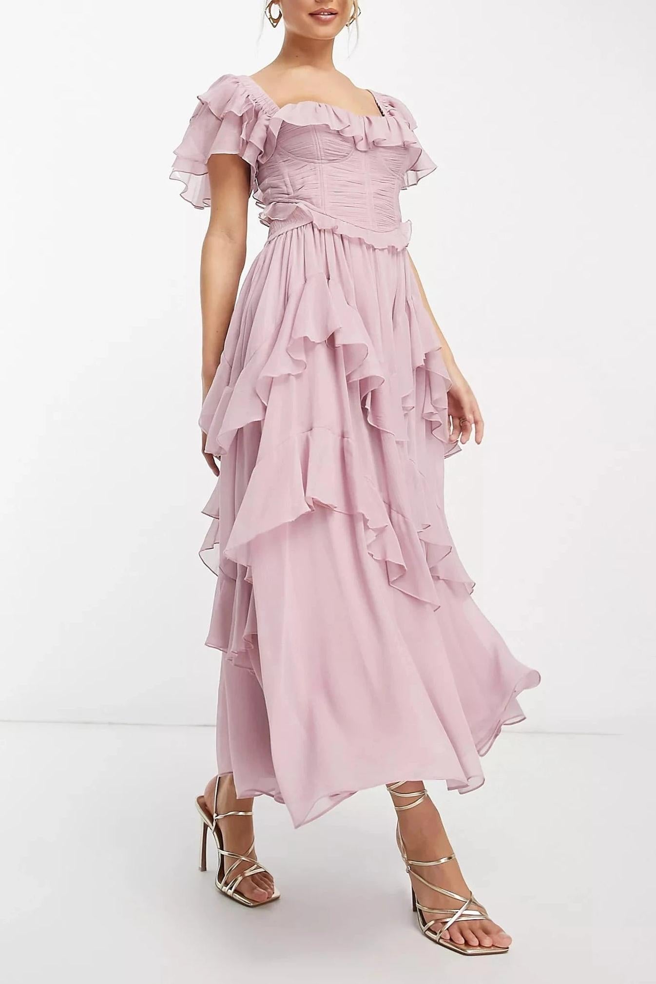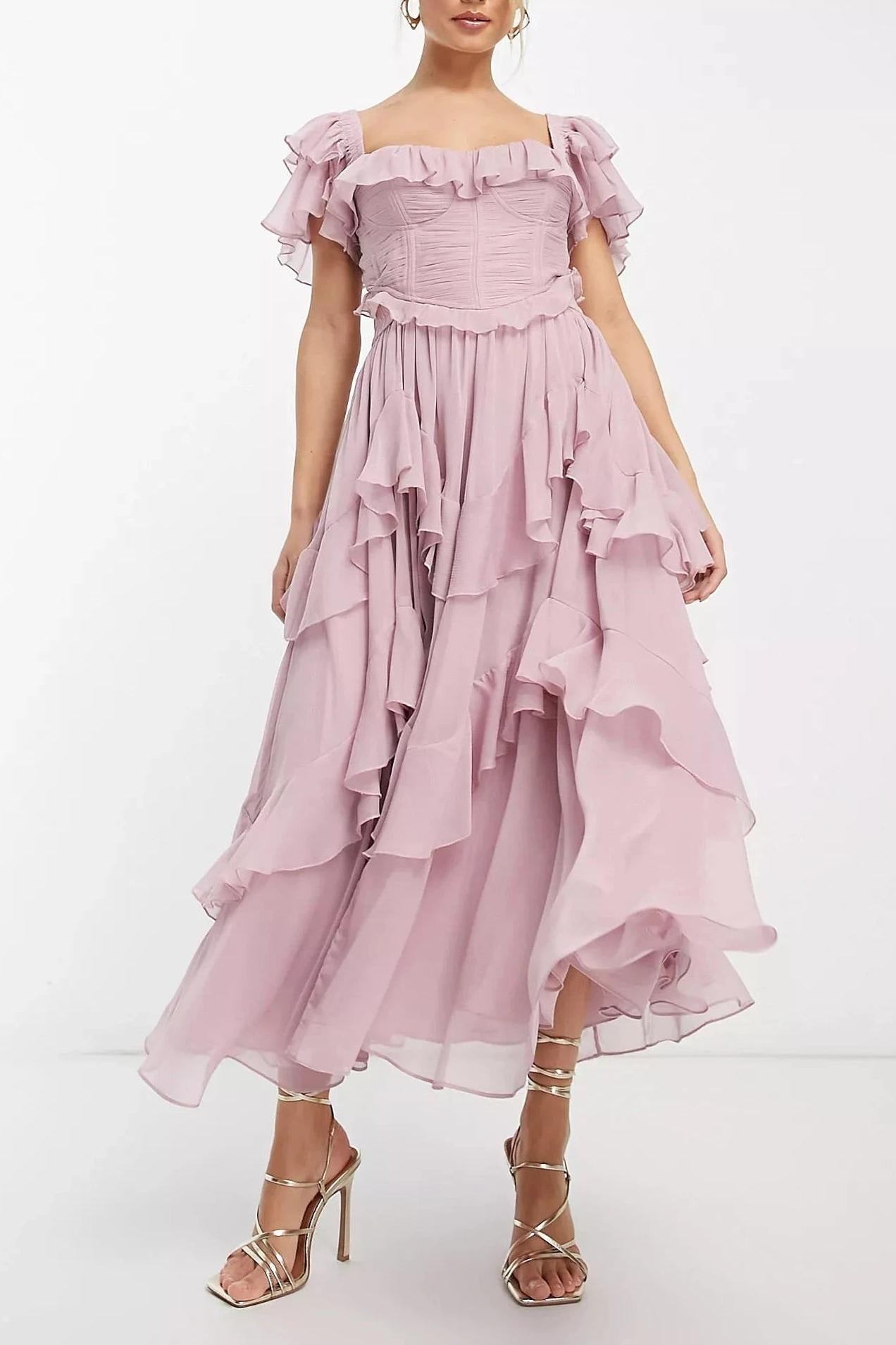 - Short sleeves, solid color, pink, ruffle, pleated, midi dress