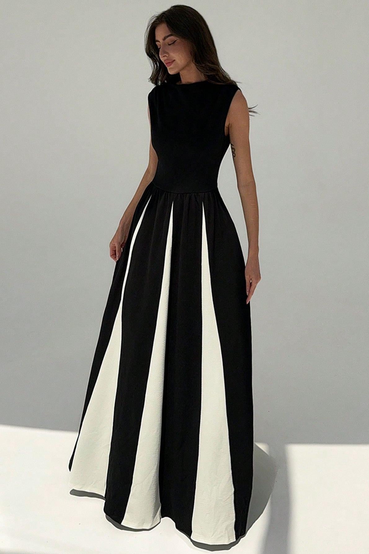 - Sleeveless, contrast color, black, white, round neck, midi dress