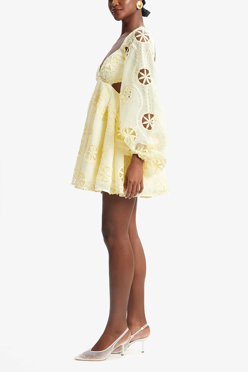 - Long sleeves, solid color, yellow, cut-out, V-neck, puff sleeve, mini dress