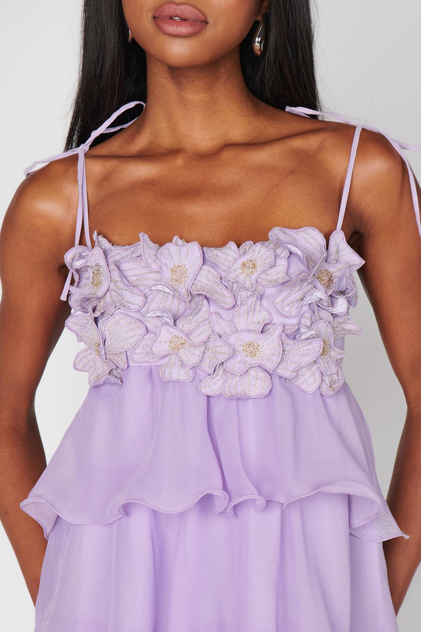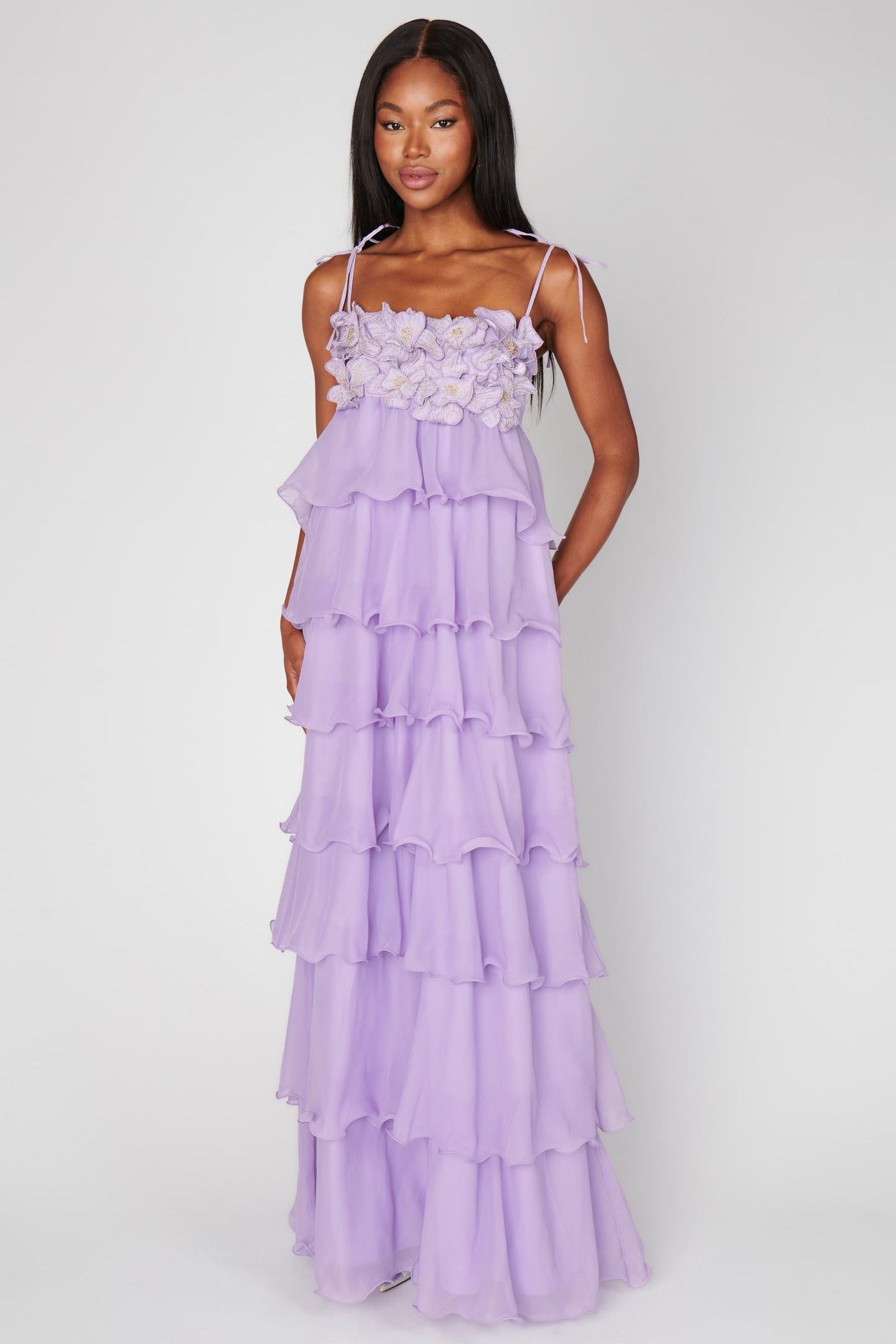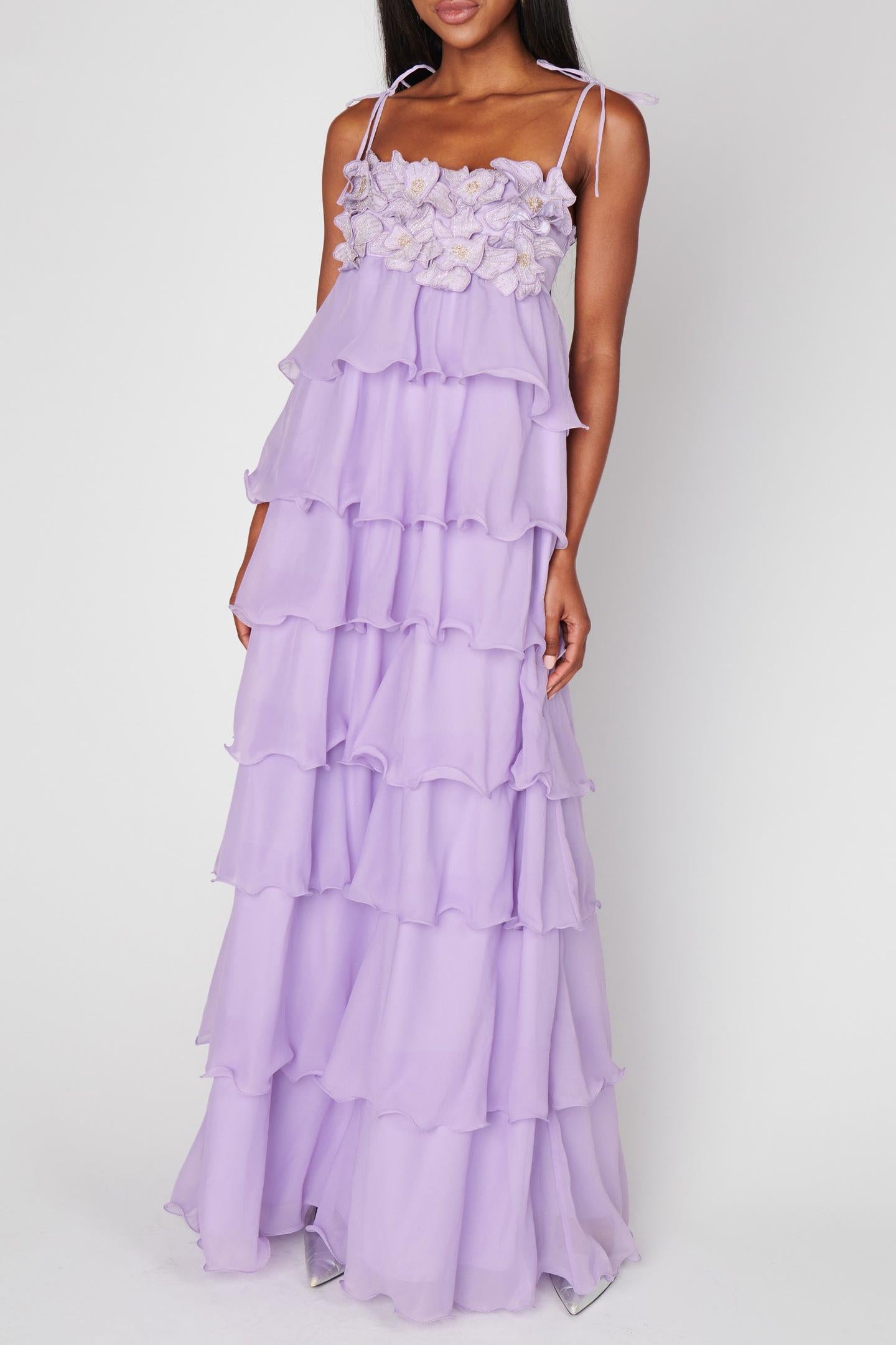 - Sleeveless, solid color, purple, embroidered, chiffon, ruffle, maxi dress