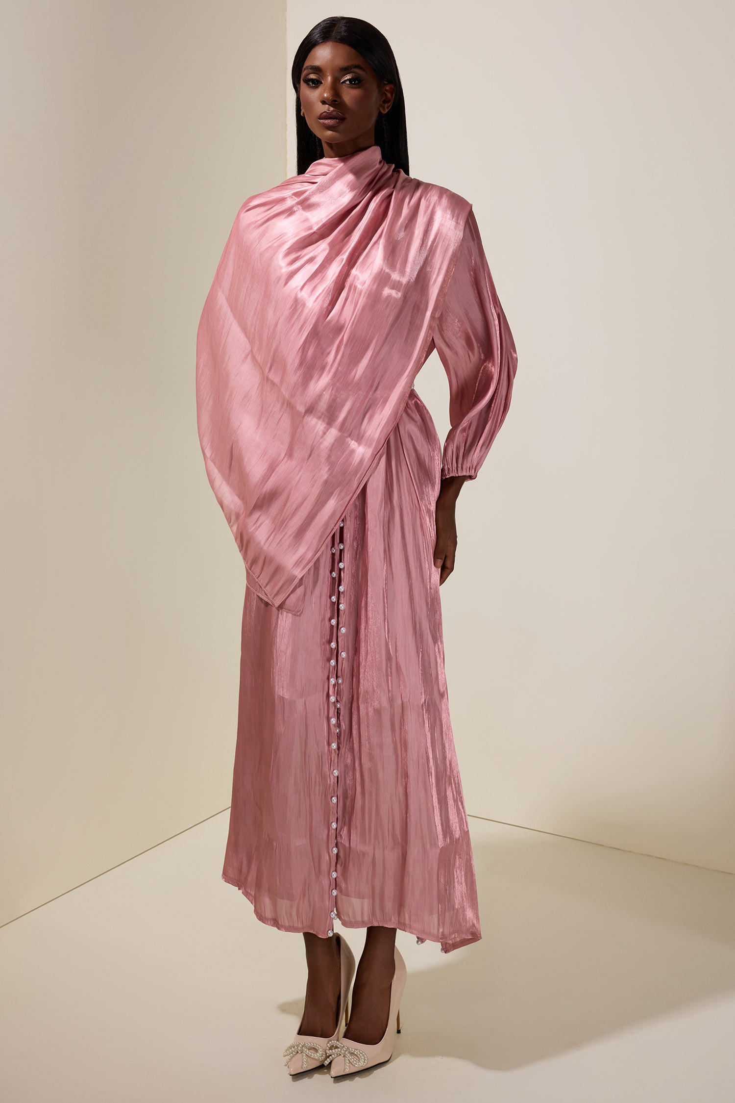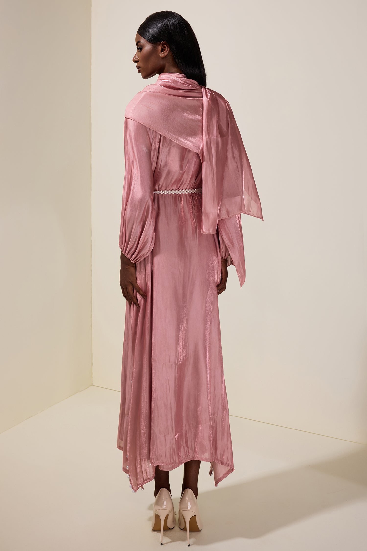 - Long sleeve, faux pearl, puff sleeve, solid color, pink, midi dress