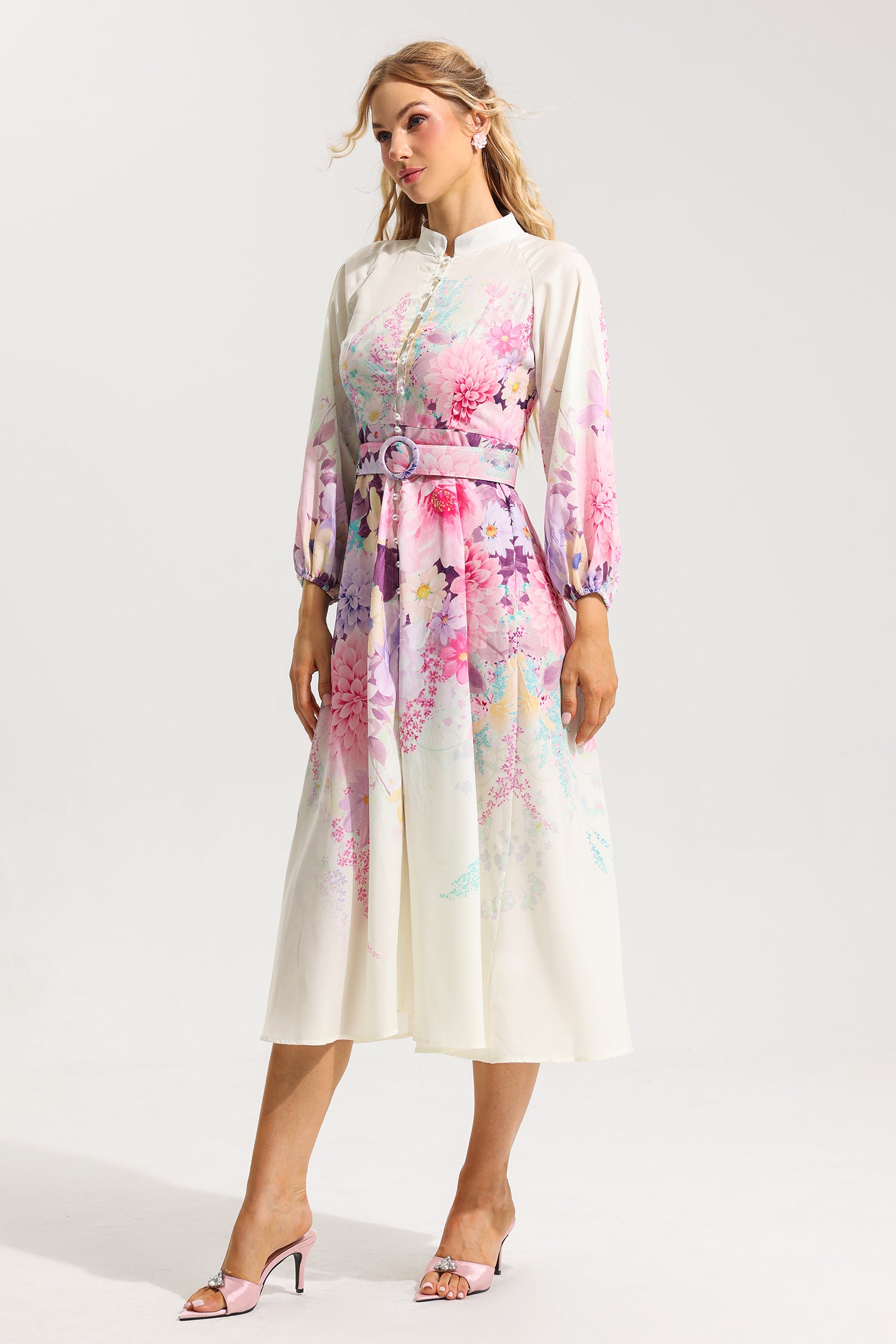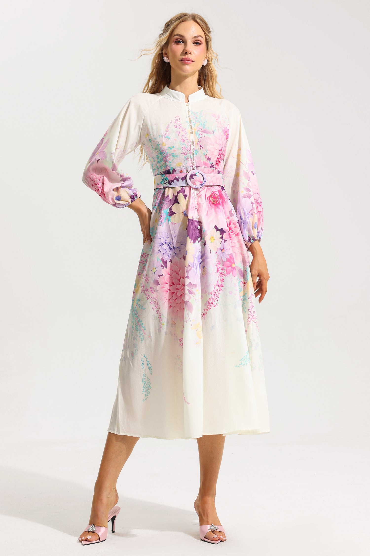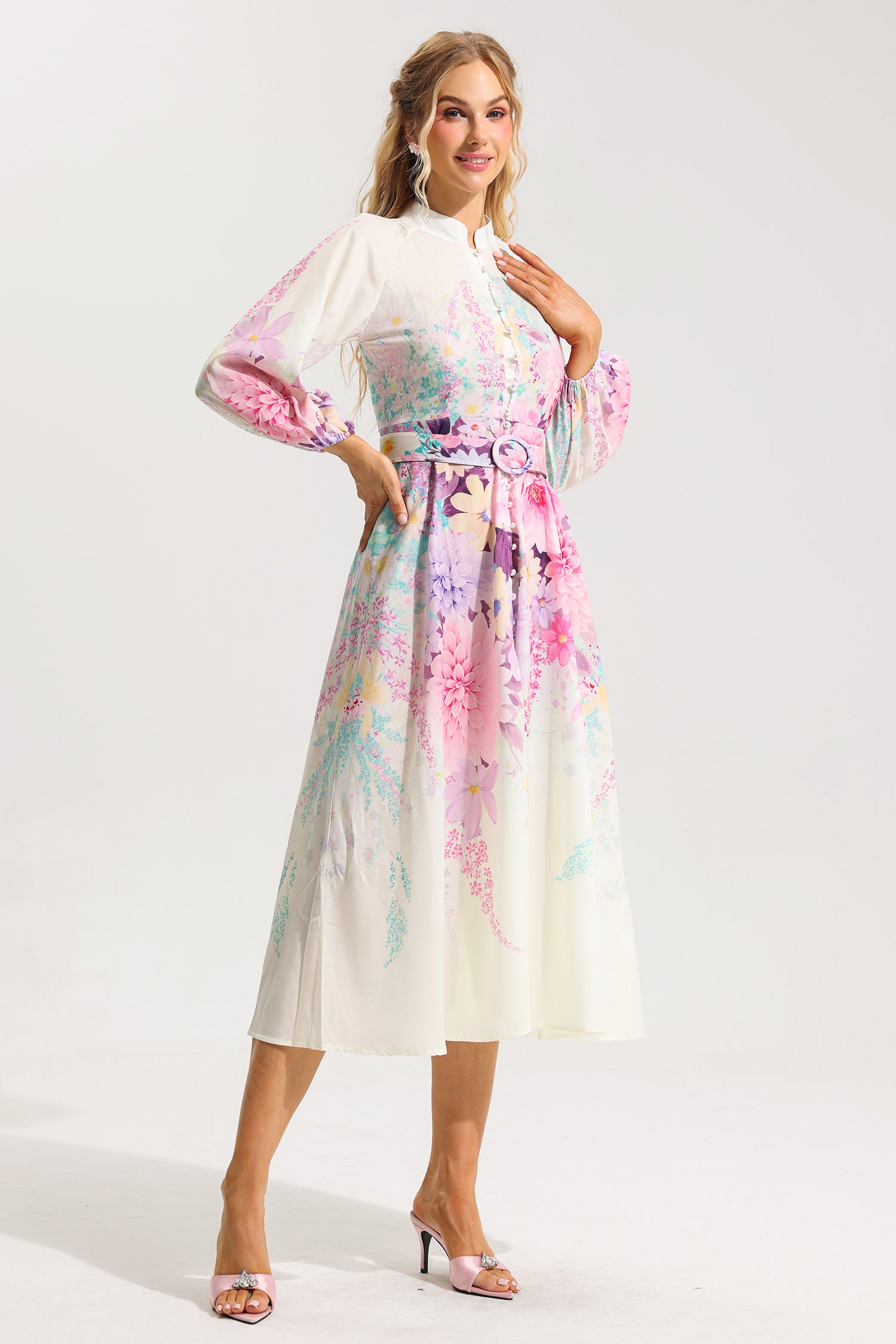 - Floral print, bottom, lantern sleeve, midi dress, white, belted, long sleeve