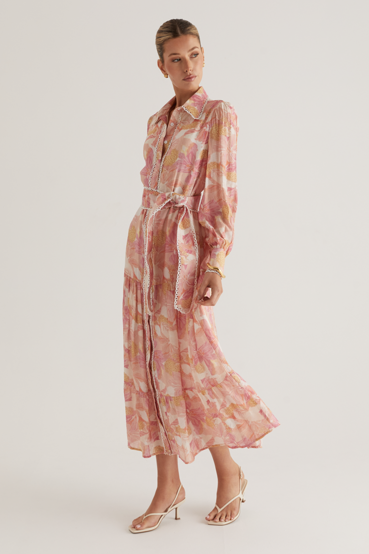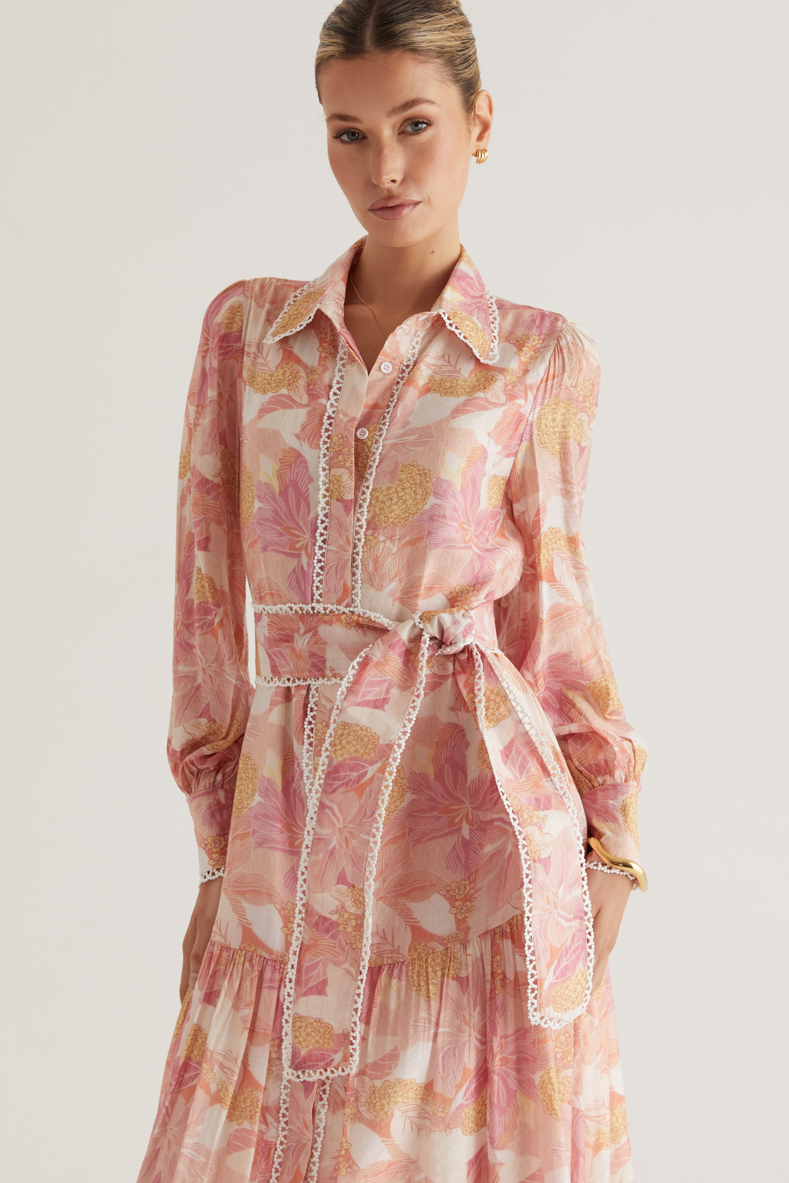 - Sleeveless, floral printed, pink, lace edge, lace-up, midi dress