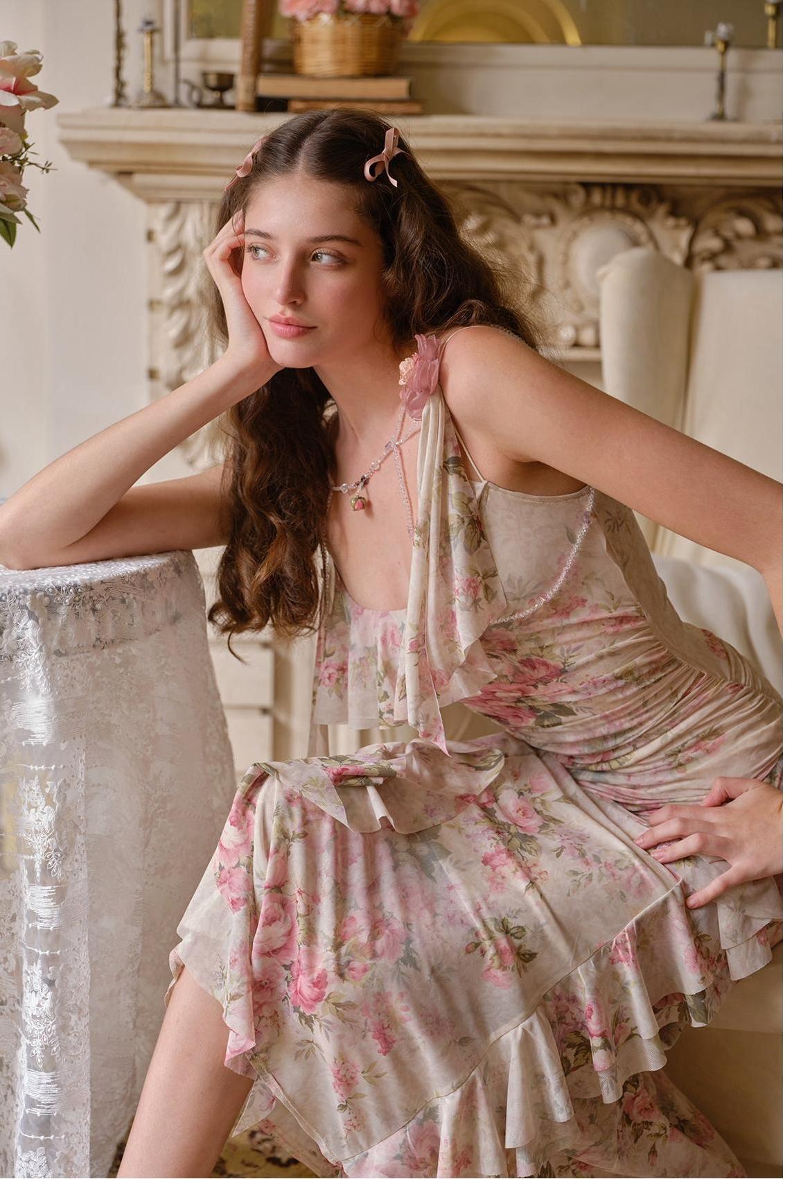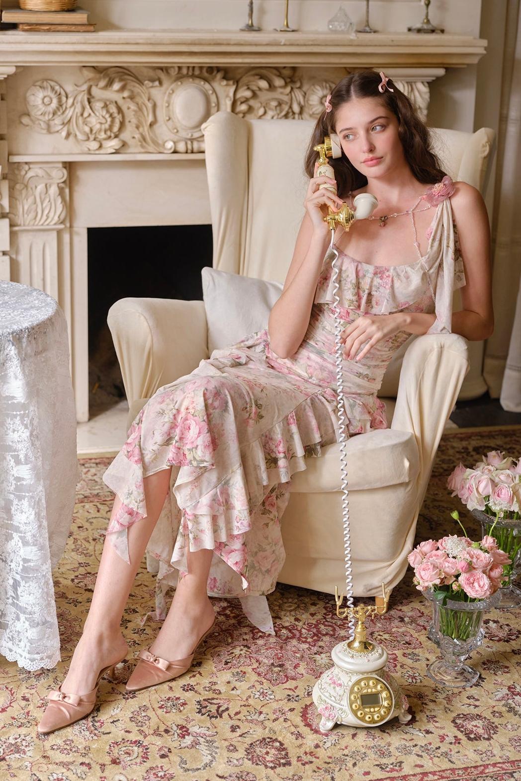 - Sleeveless, floral print, mesh, frill, slip, midi dress