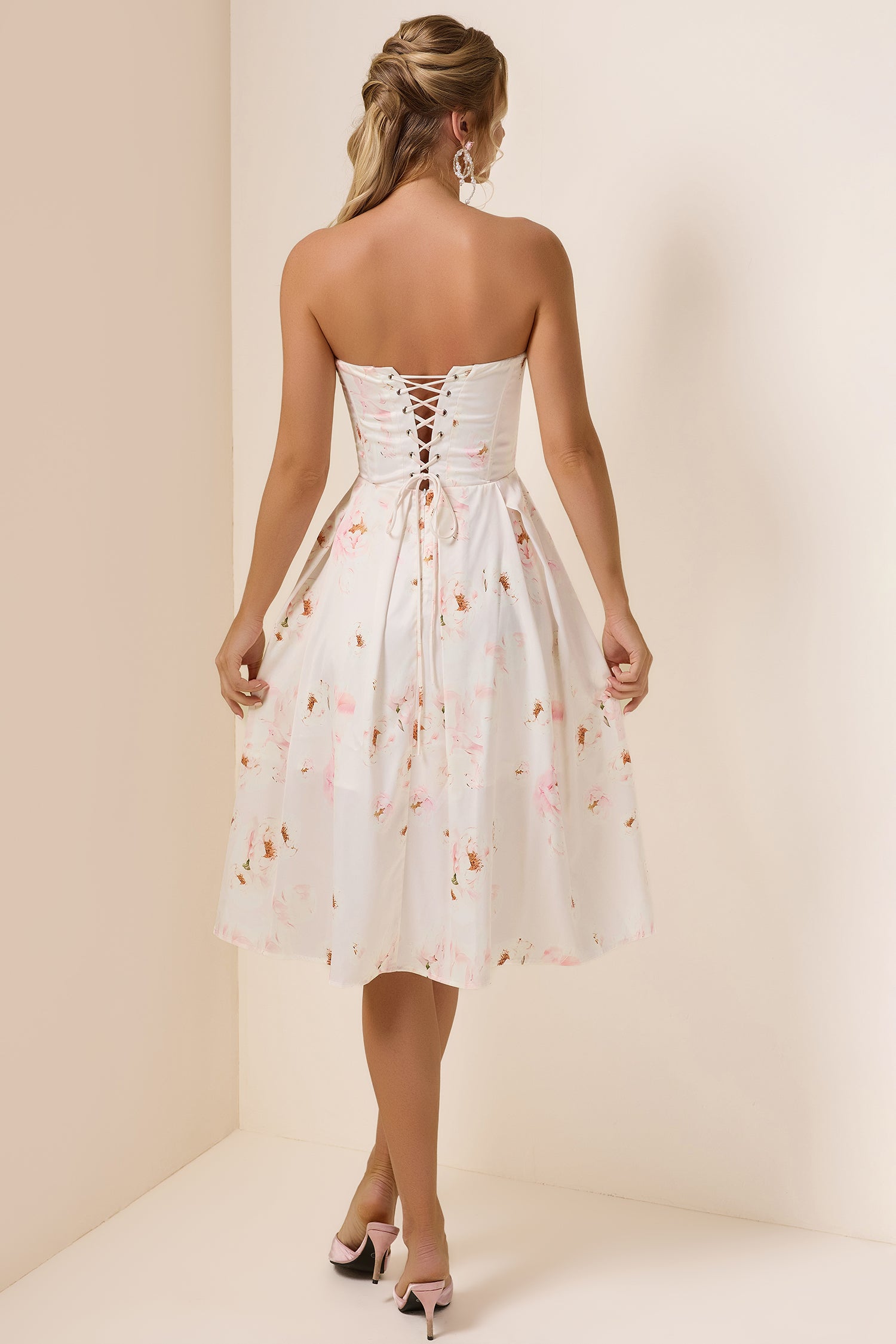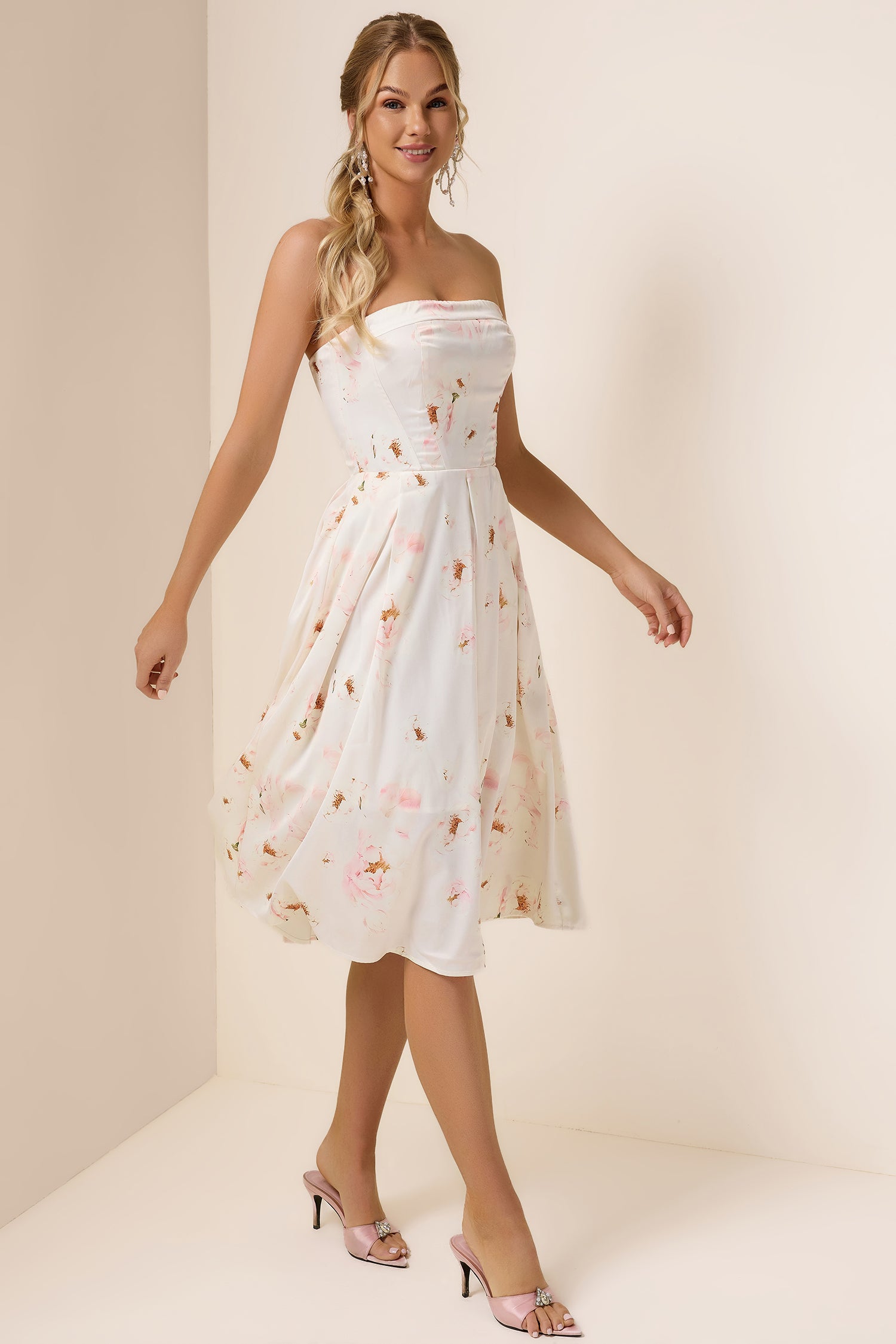 - Sleeveless, off shoulder, lace up, floral print, apricot, midi dress