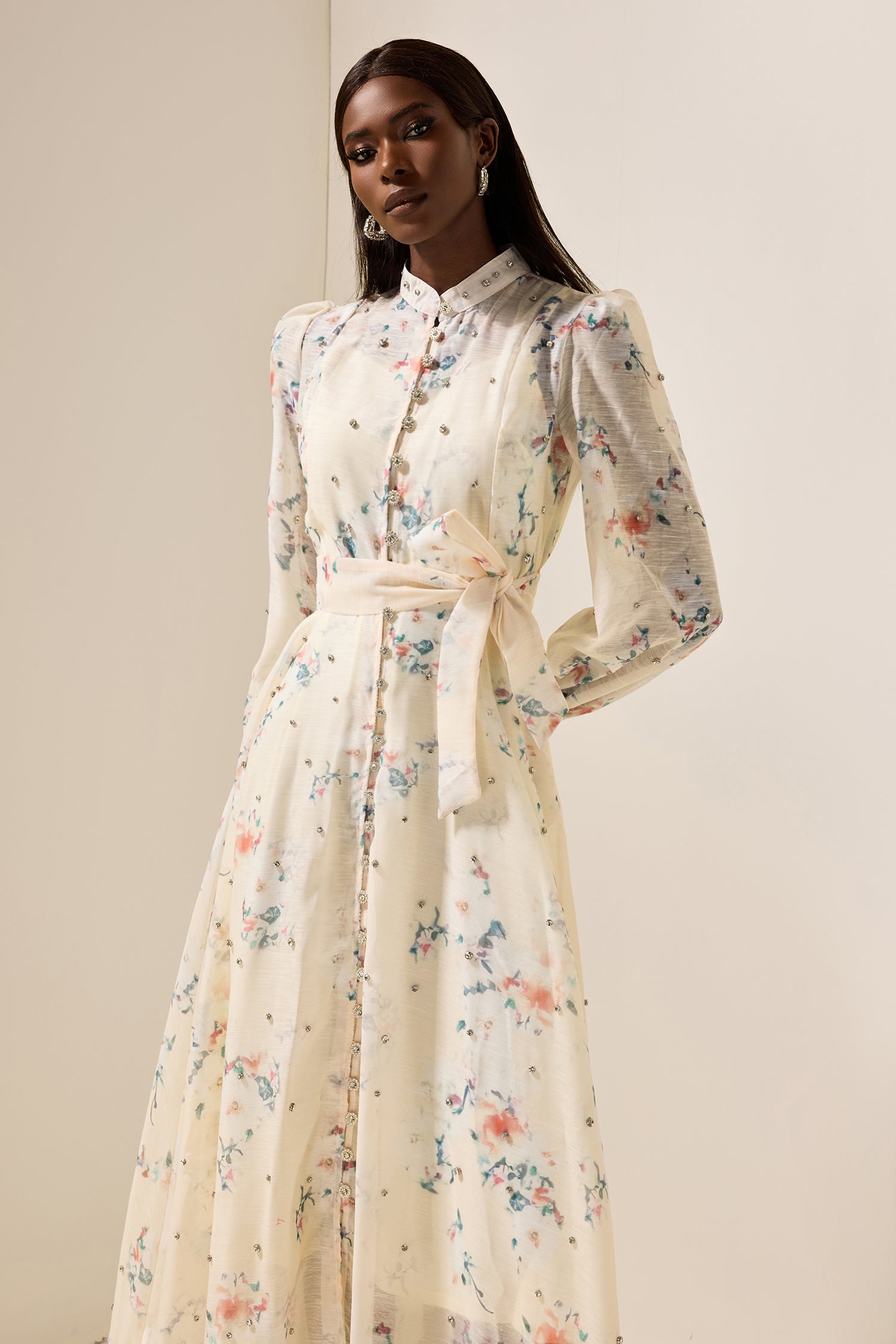 - Long sleeve, solid color, beige, floral prints, rhinestone, midi dress
