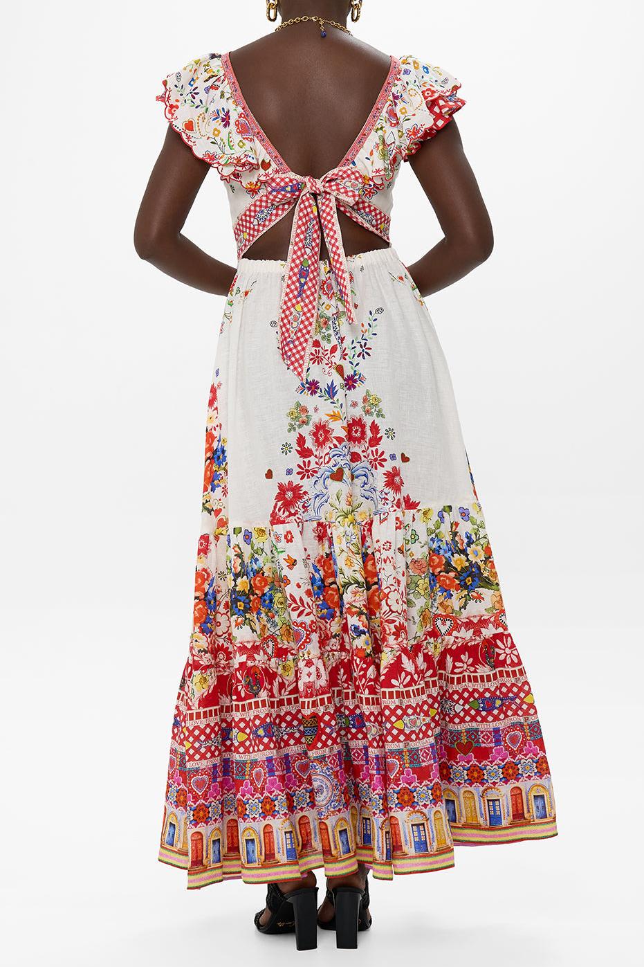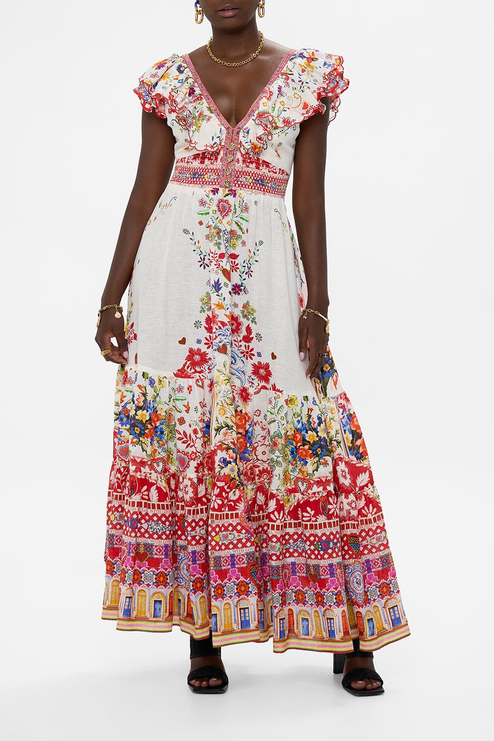 - Floral print, sleeveless, ruffle, v-neck, midi dress,