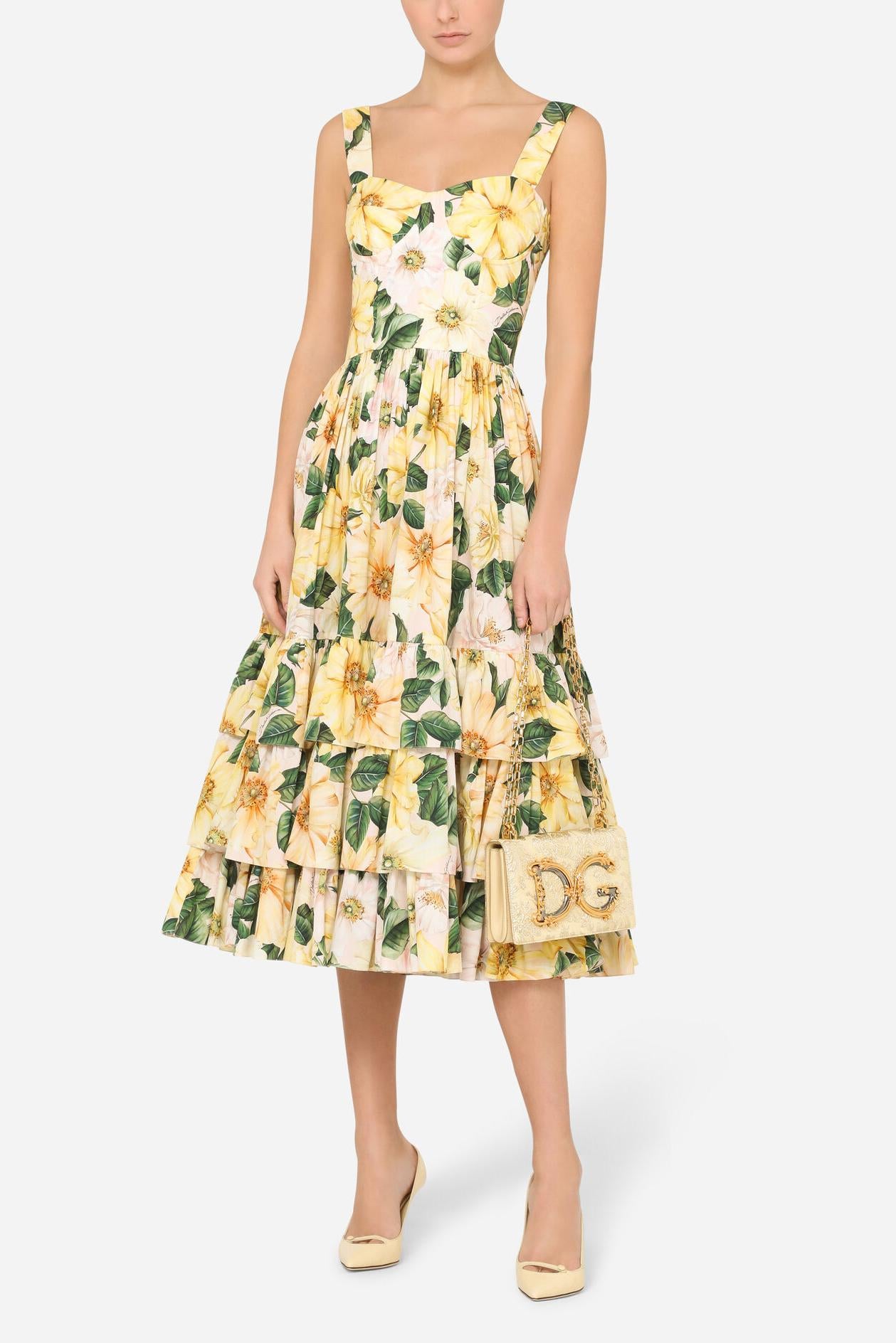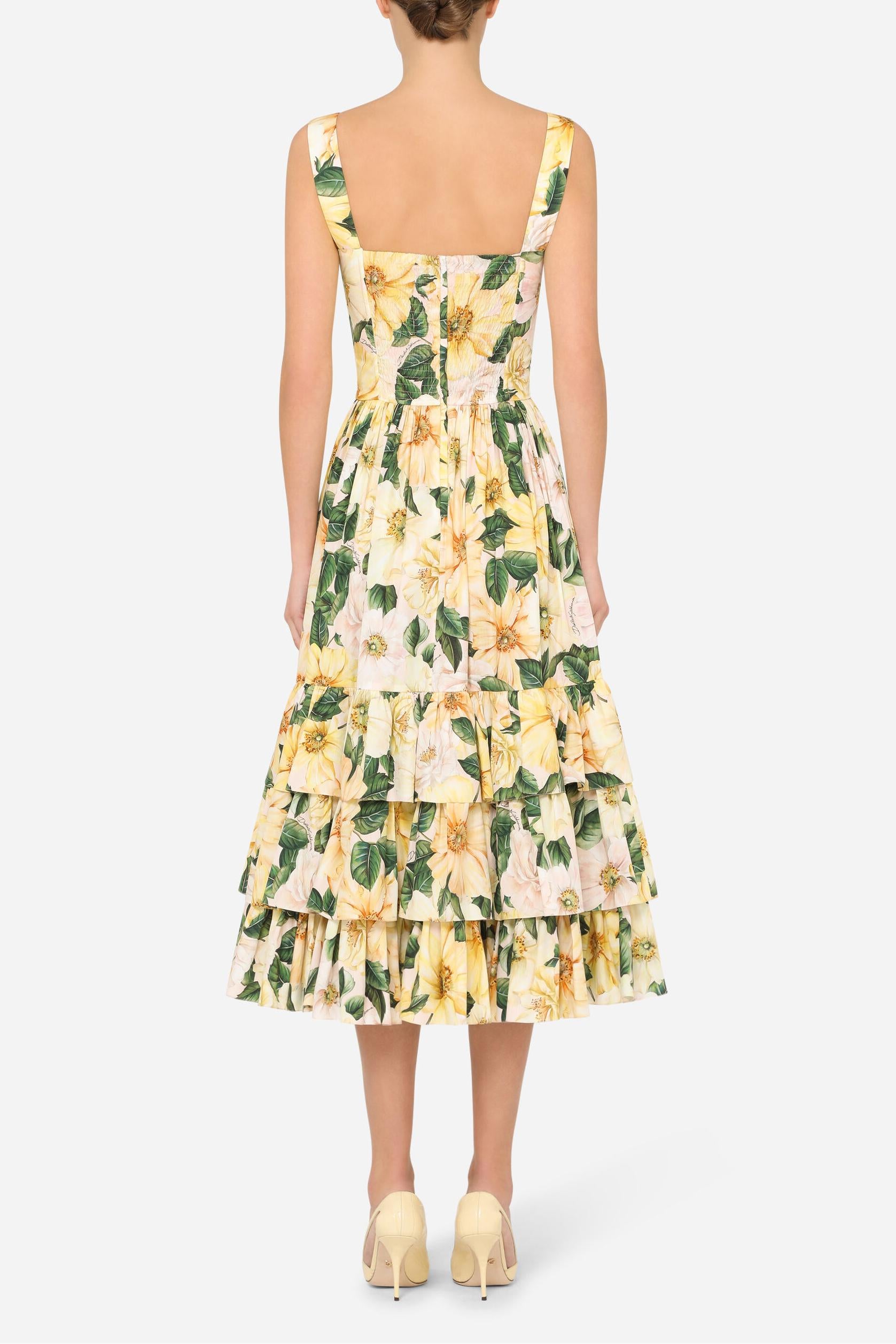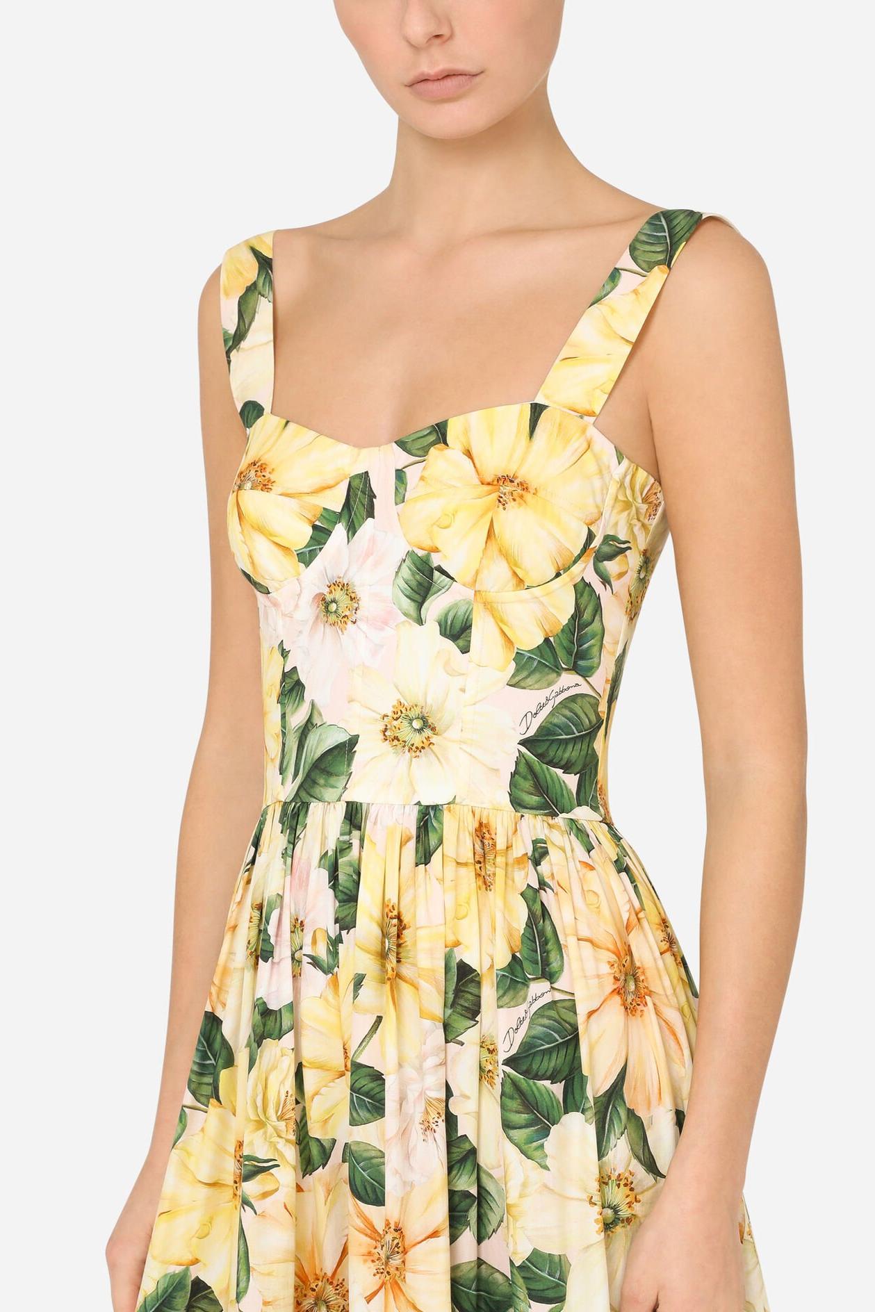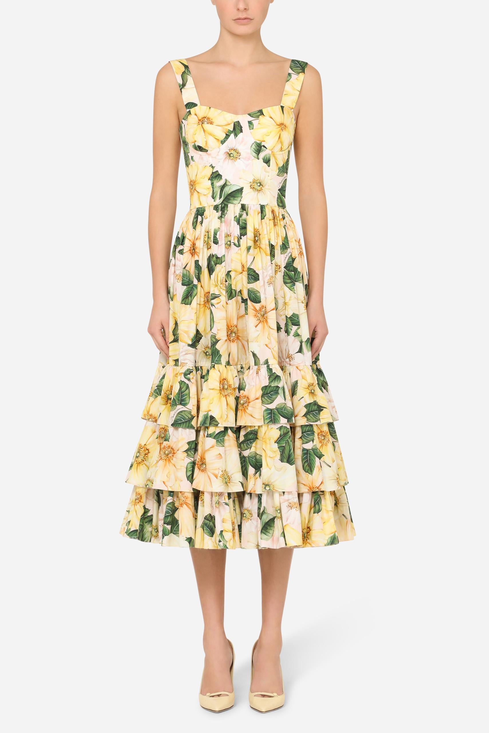 - Sleeveless, floral print, yellow, sweetheart neck, midi dress