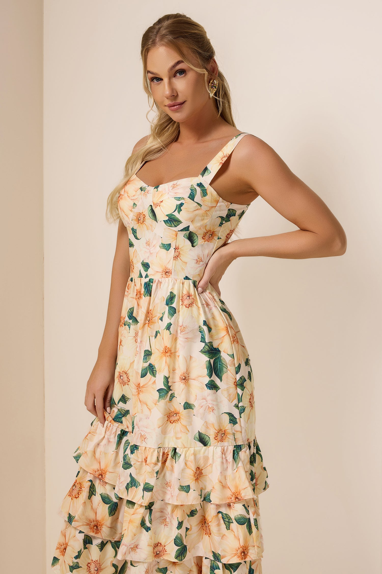 - Sleeveless, floral print, yellow, sweetheart neck, midi dress