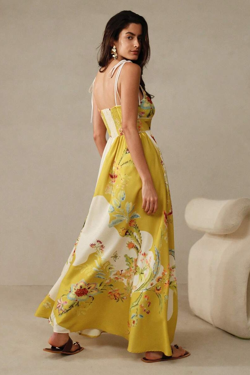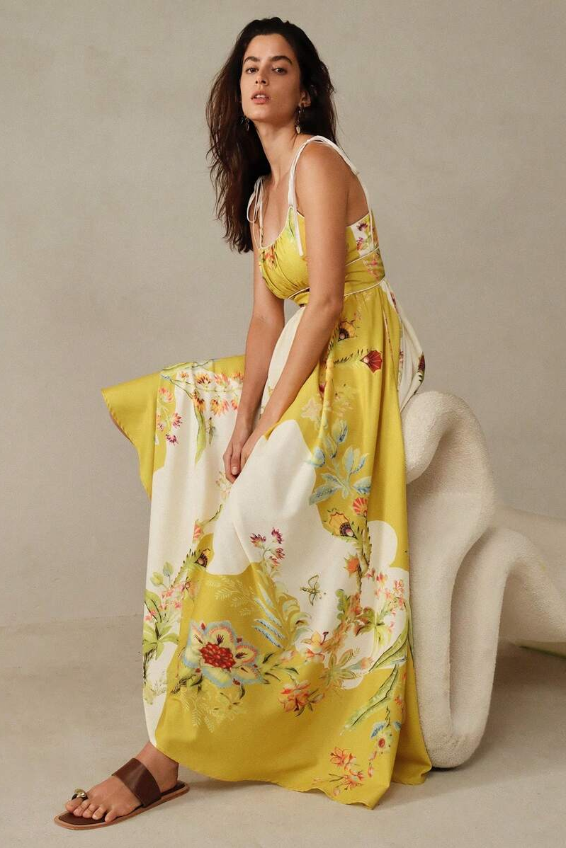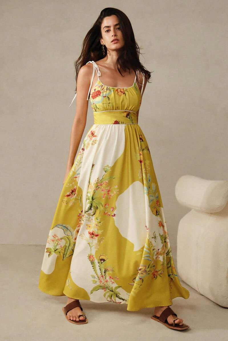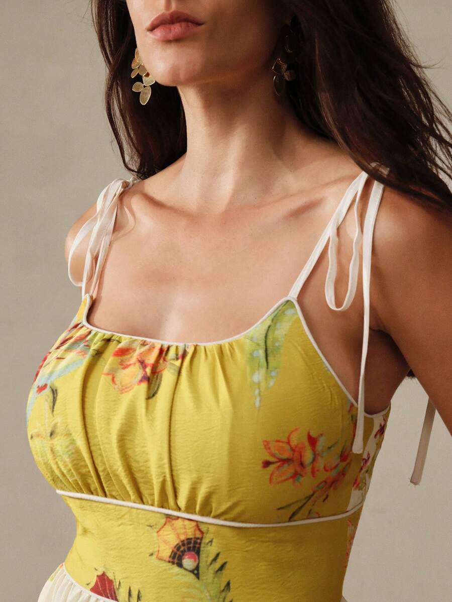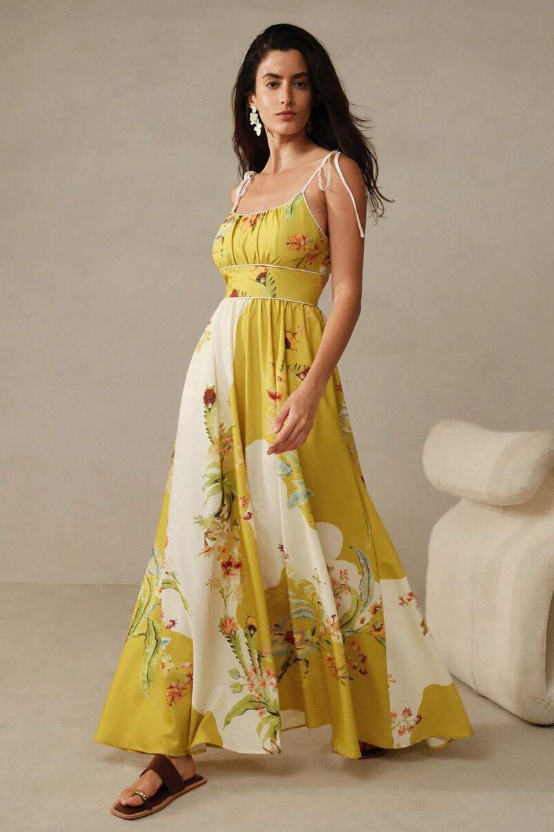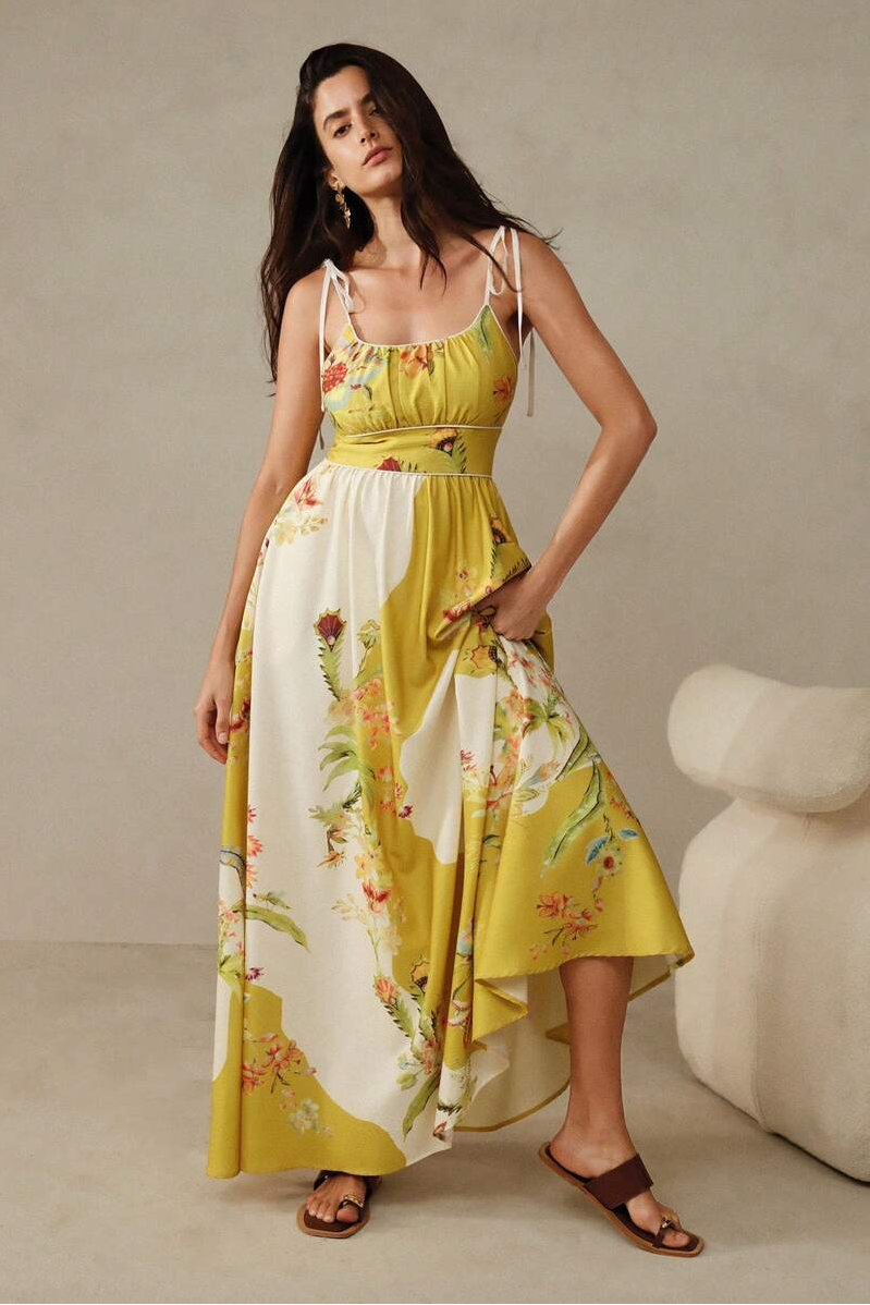 - Sleeveless, yellow, floral prints, slip, midi dress