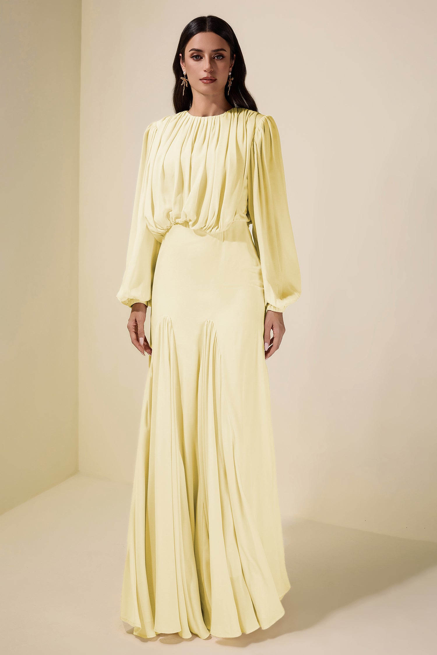 - Long sleeve, gathering, round neck, lantern sleeve, solid color, yellow, maxi dress