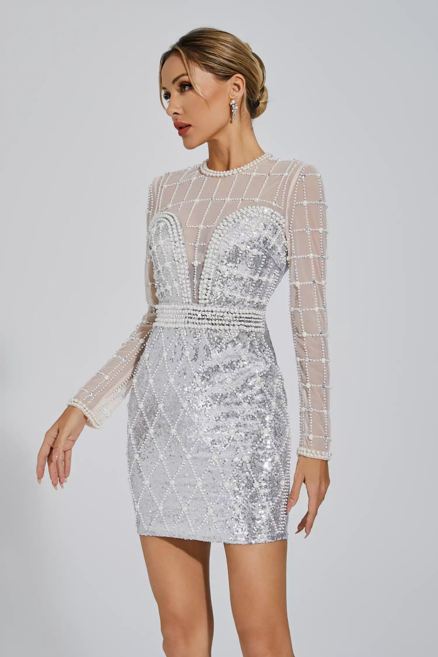 The Iliana Silver Pearl Embellished Sequin Dress exudes elegance and sophistication. Crafted with intricate pearl embellishments and shimmering sequins, this dress is a perfect choice for evening events. Its long sleeves and sheer net fabric add an alluring touch. Make a stunning entrance with this fashion-forward piece.