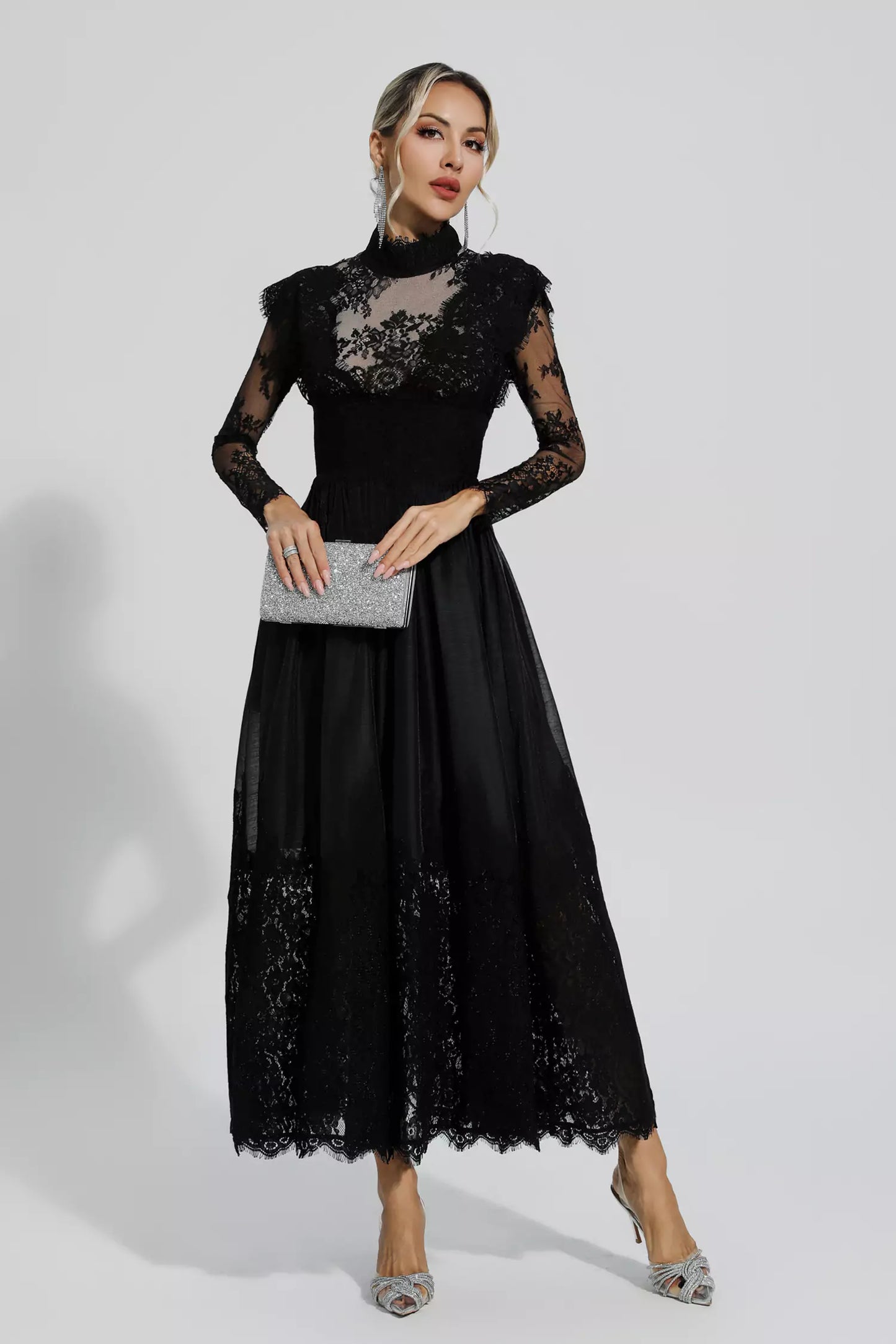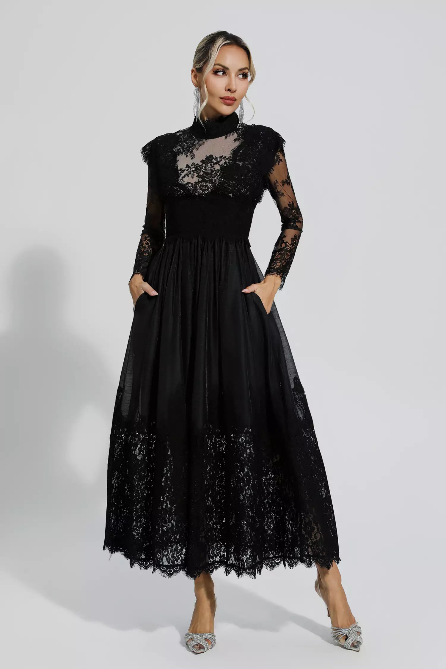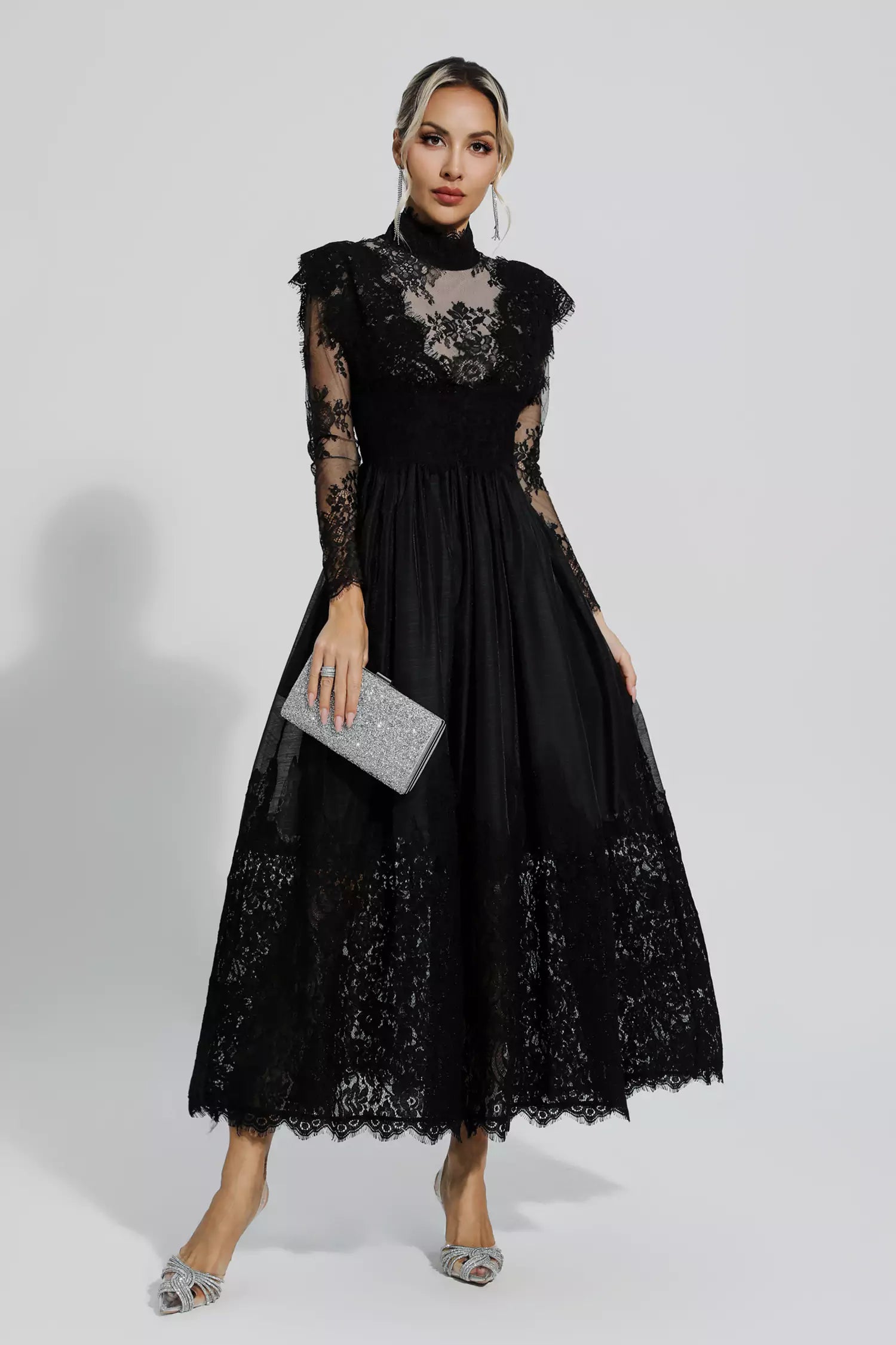 Jamie Black Floral Lace Stitching Long Sleeve Dress