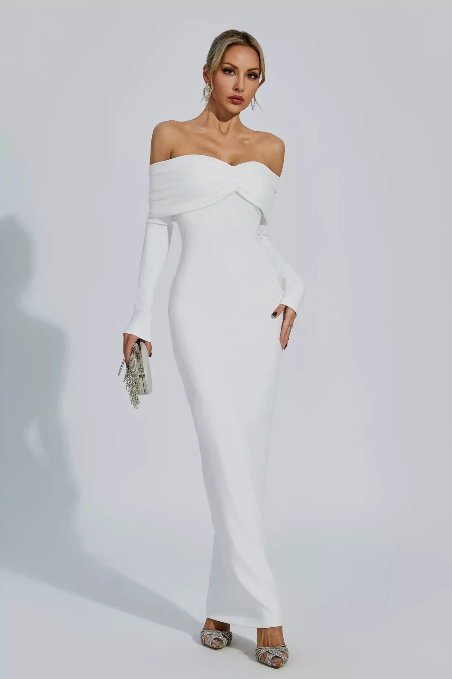 With its elegant and flattering silhouette, the Kiana White Pleated Off-Shoulder Dress is perfect for any occasion. Its white hue adds a touch of sophistication, while the stretch fabric ensures a comfortable fit. Embrace its flattering silhouette and timeless appeal for any occasion. Elevate your style with this stunning dress.