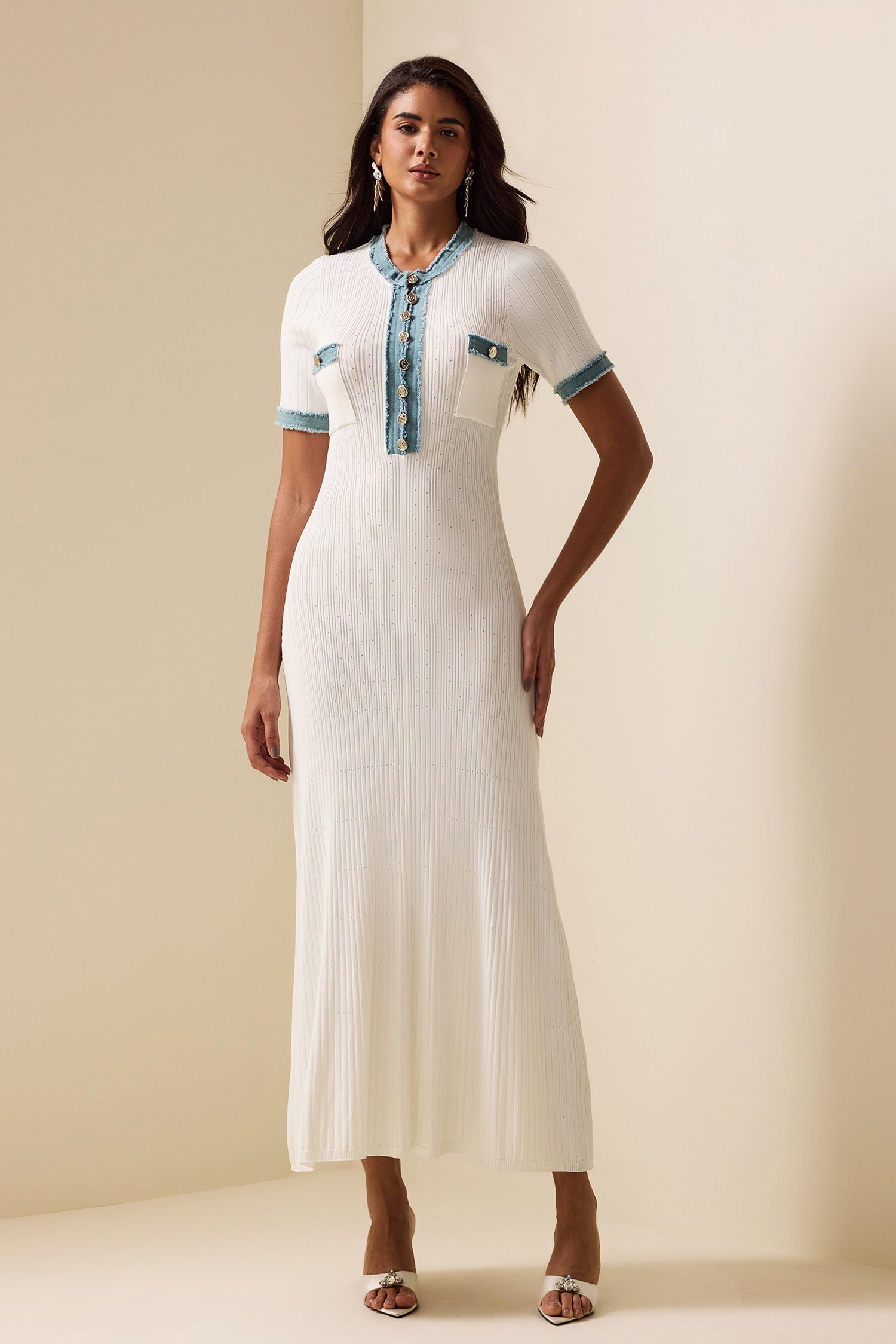 - Knit, denim, contrast color, midi dress, white, short sleeve