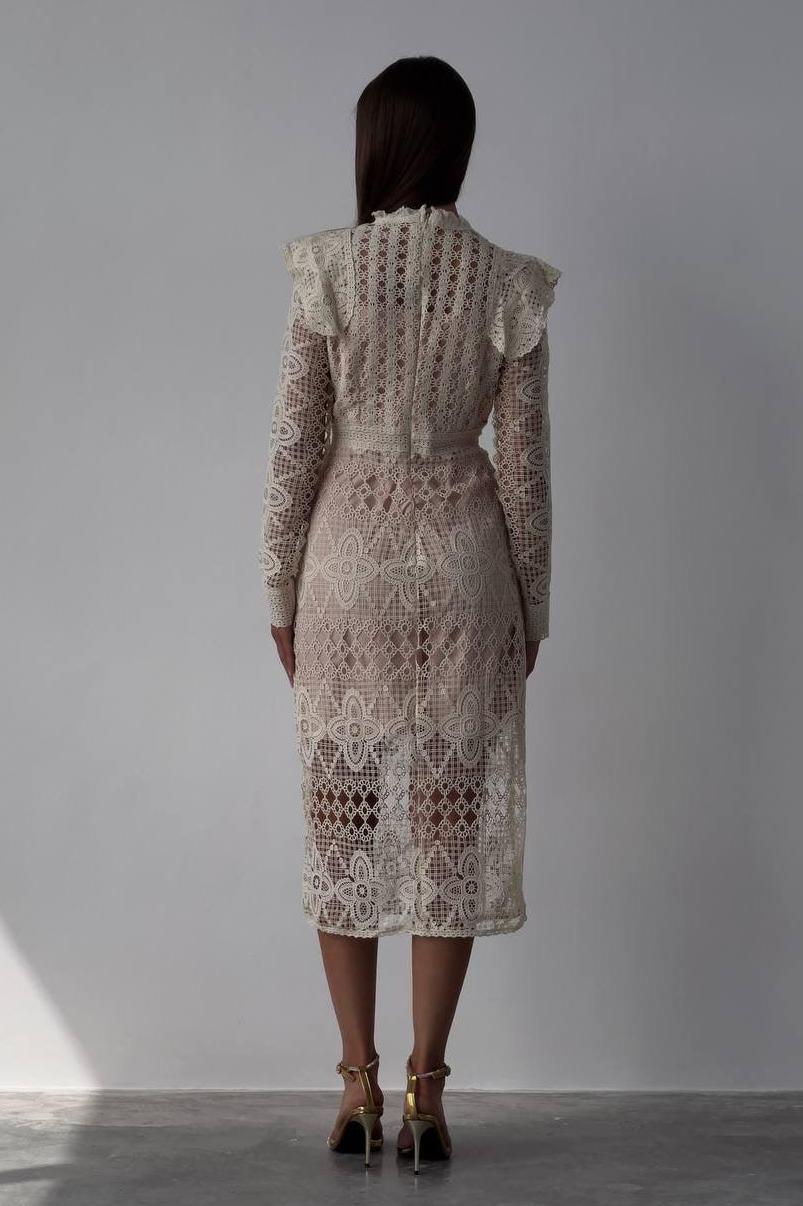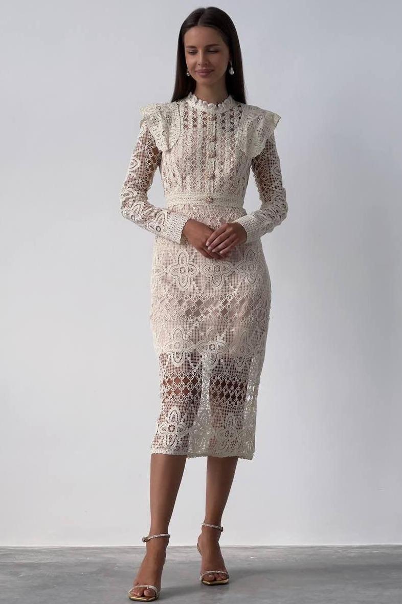 - Solid color, white, lace, midi dress, faux pearl, button, long sleeve