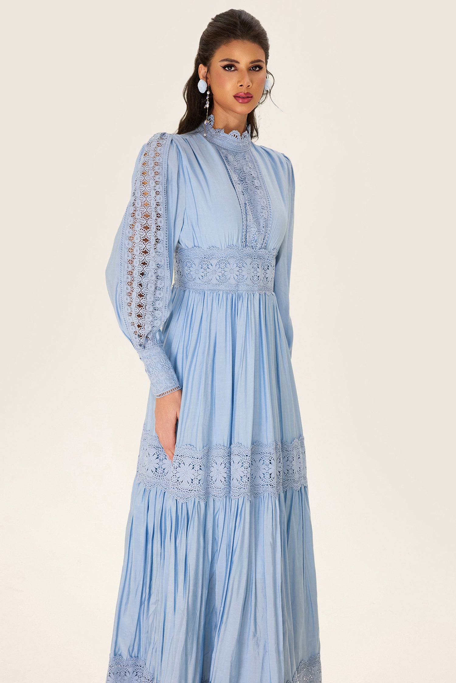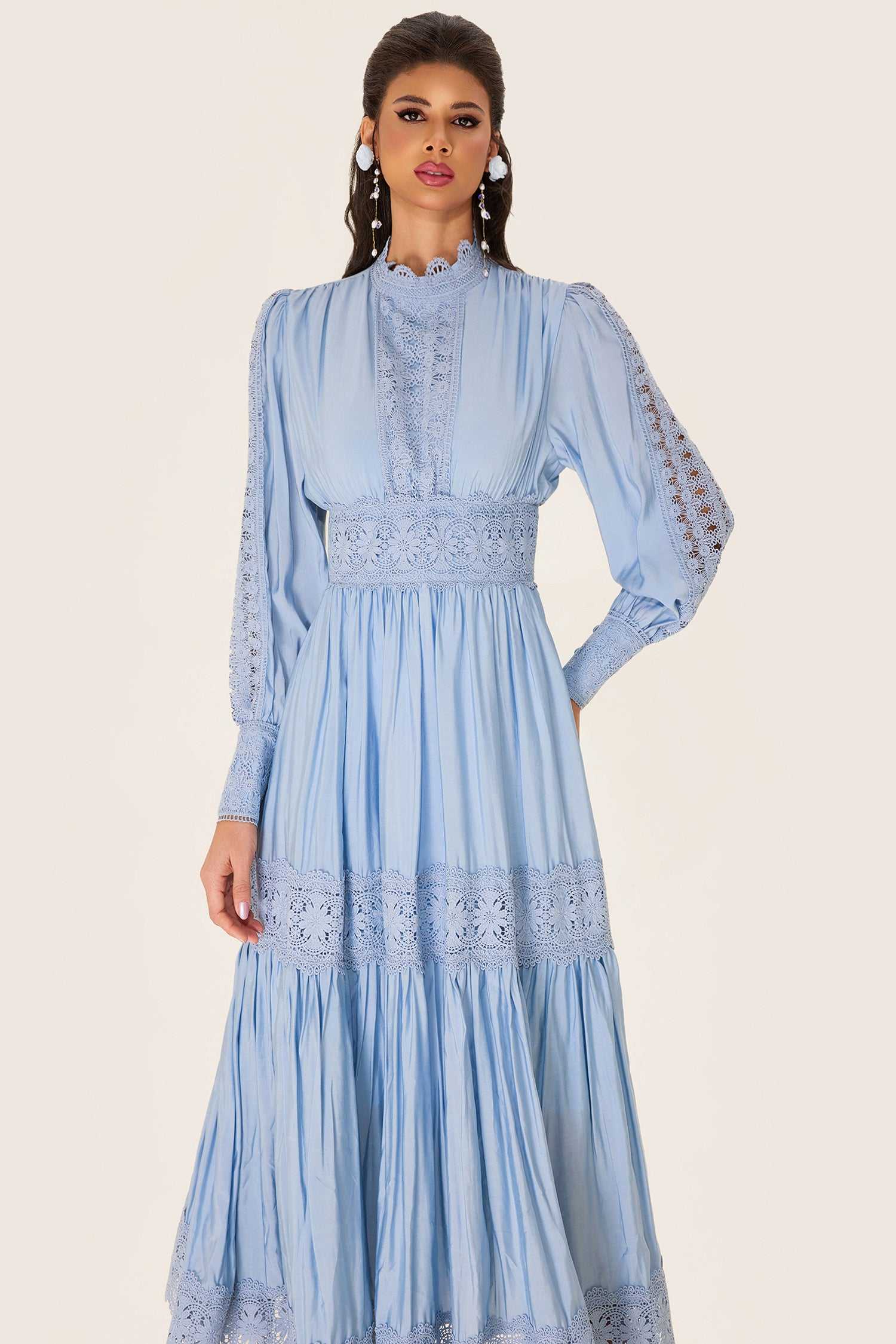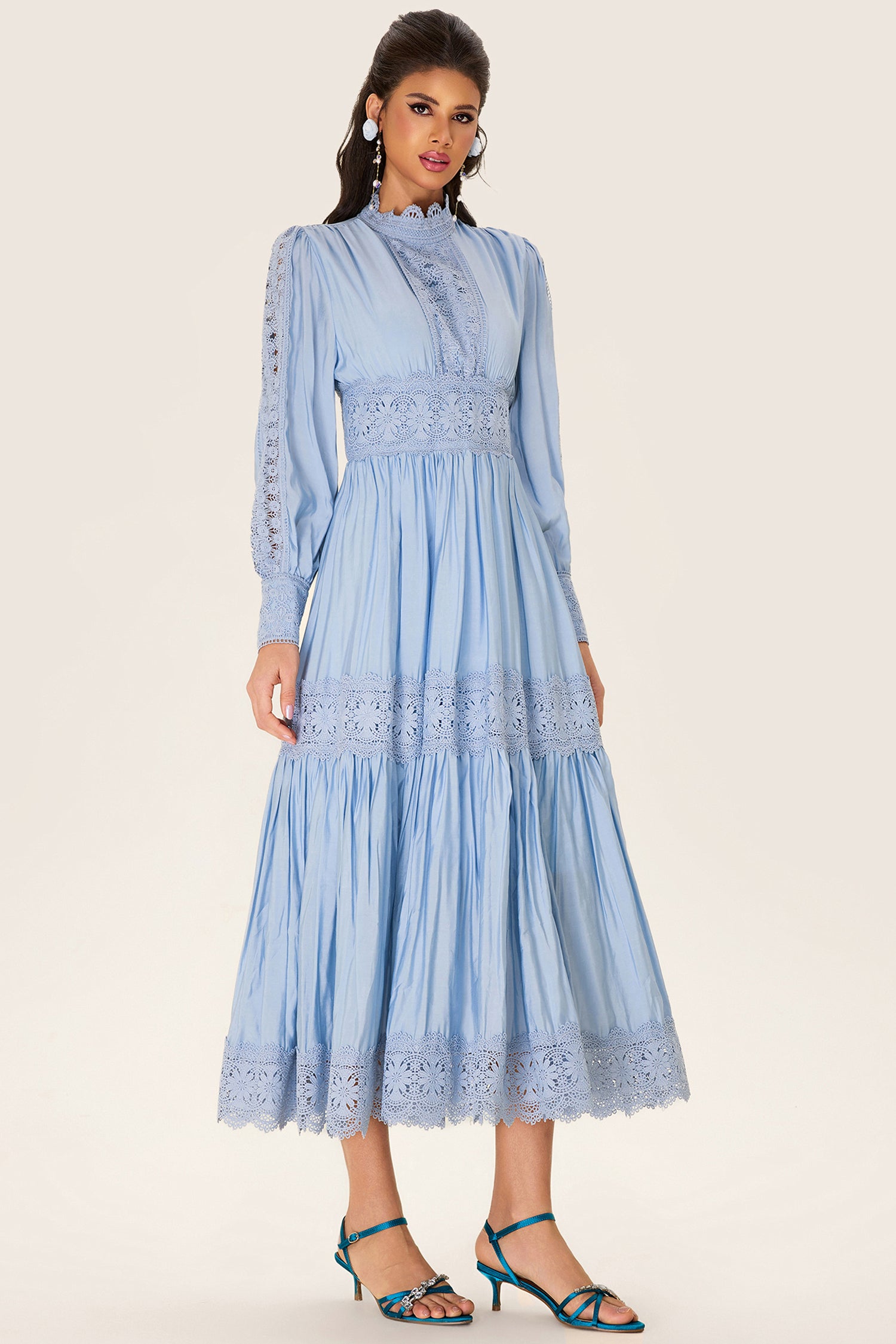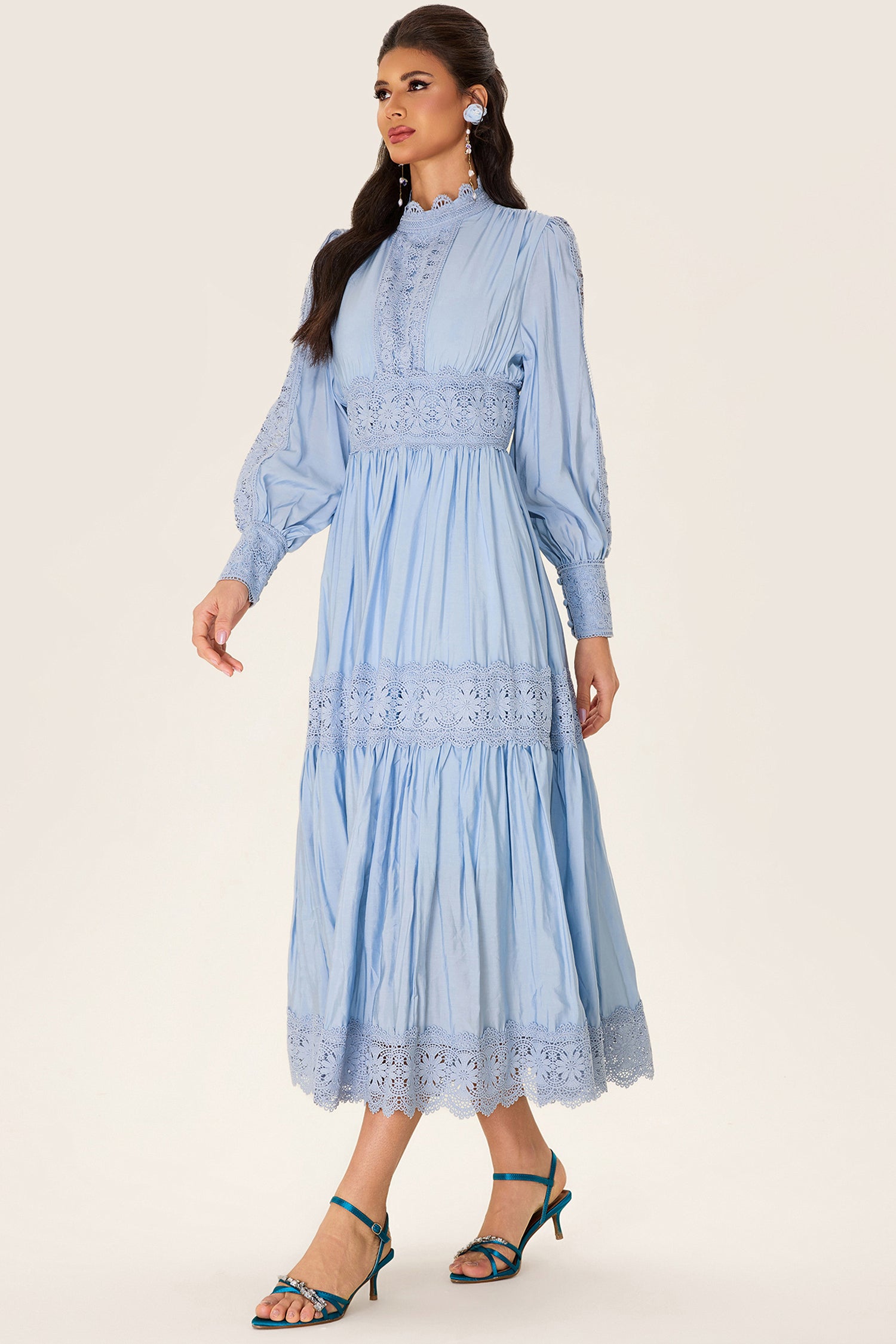 - Long sleeve, solid color, blue, lantern sleeve, midi dress