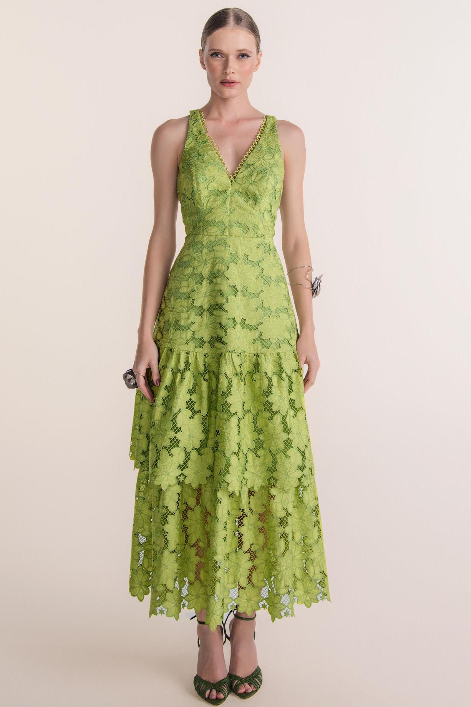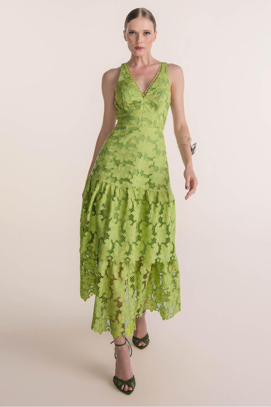- Solid color, green, lace, sleeveless, v-neck, midi dress