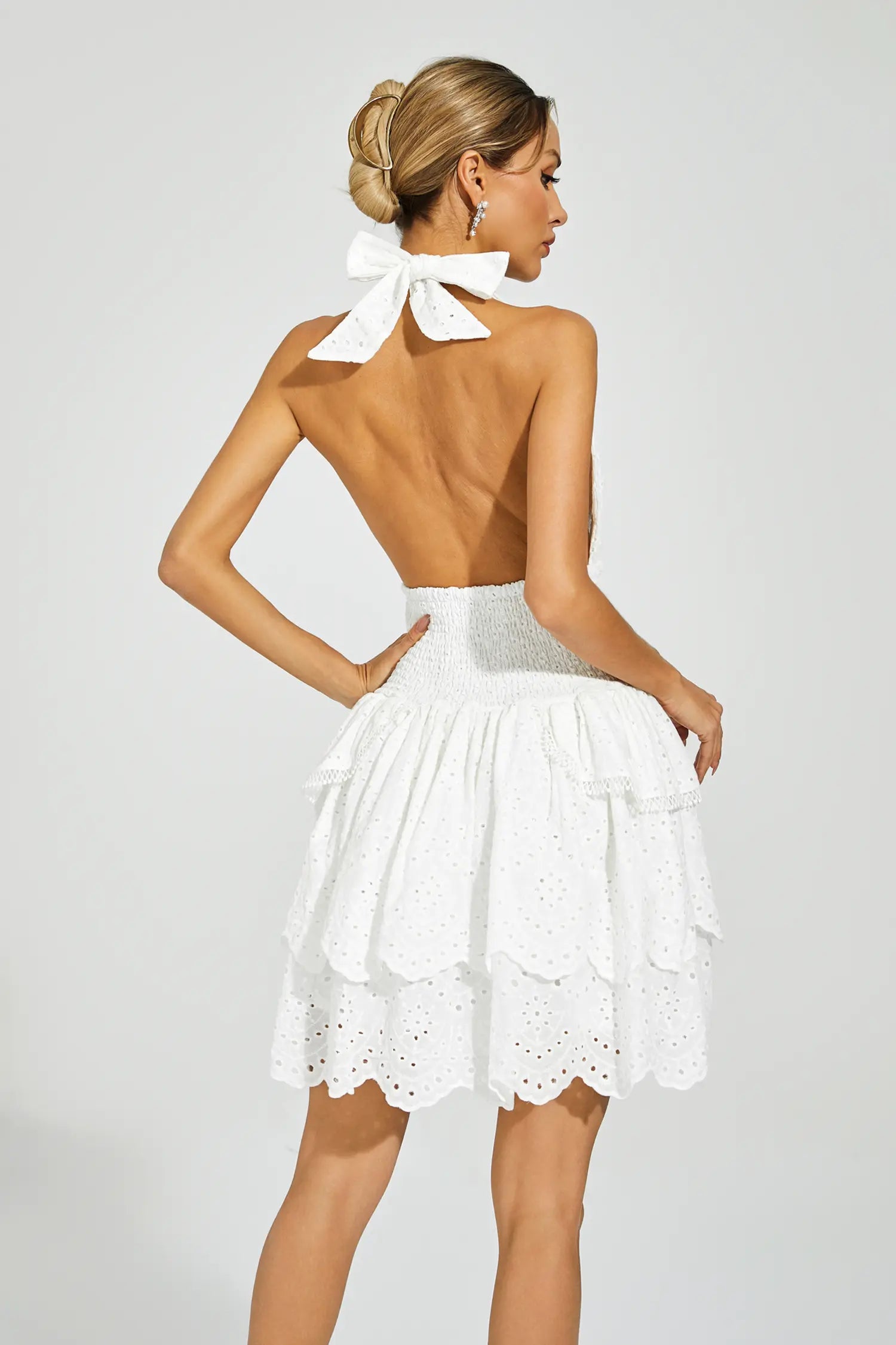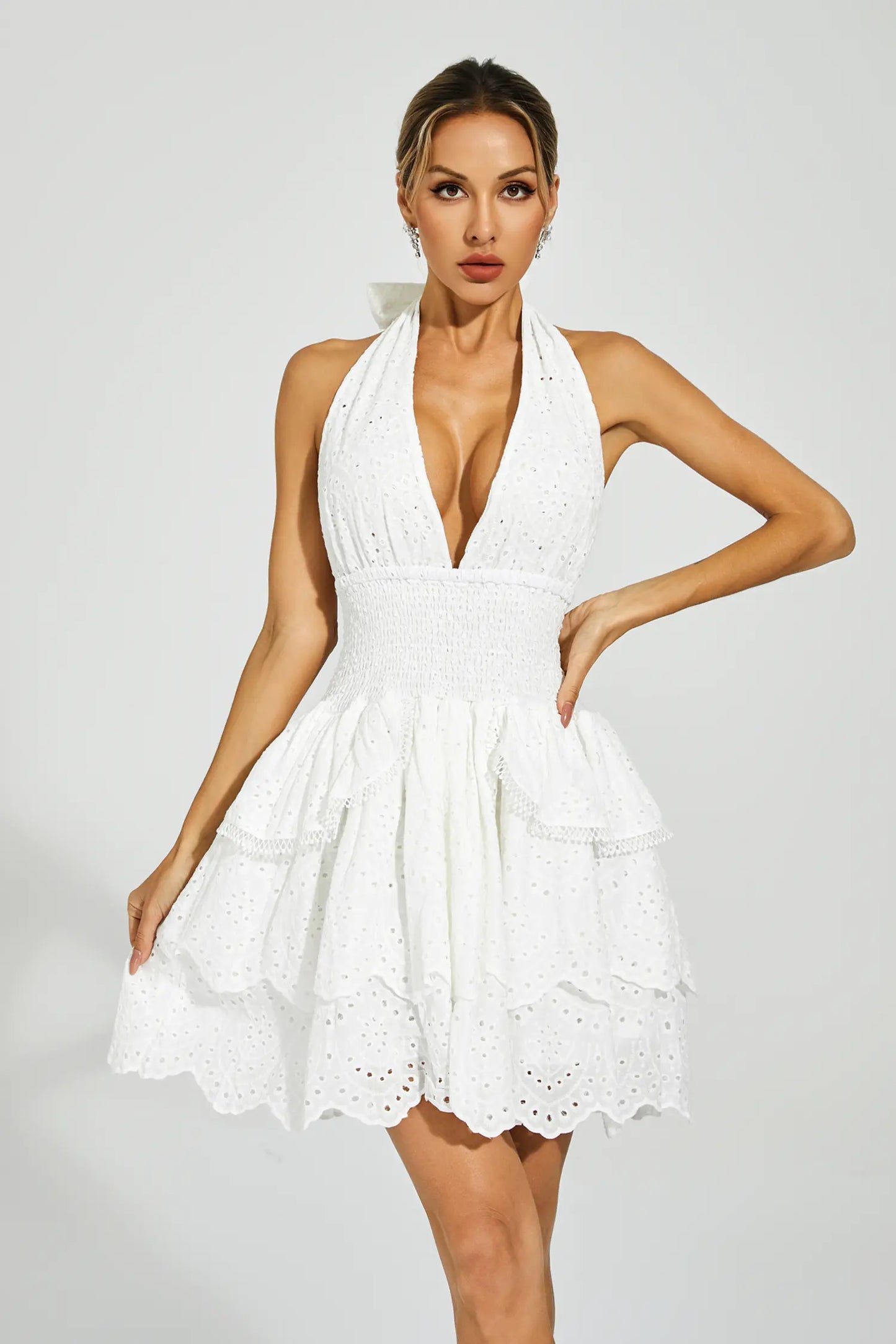 Add a touch of sophistication to your wardrobe with the Landry White V-neck Halter Dress. This sexy and chic dress features a flattering deep V-neckline and a sleeveless design. Made from high-quality fabric, the white color exudes elegance. With its high-waisted silhouette and halter neck, this dress is perfect for any special occasion.