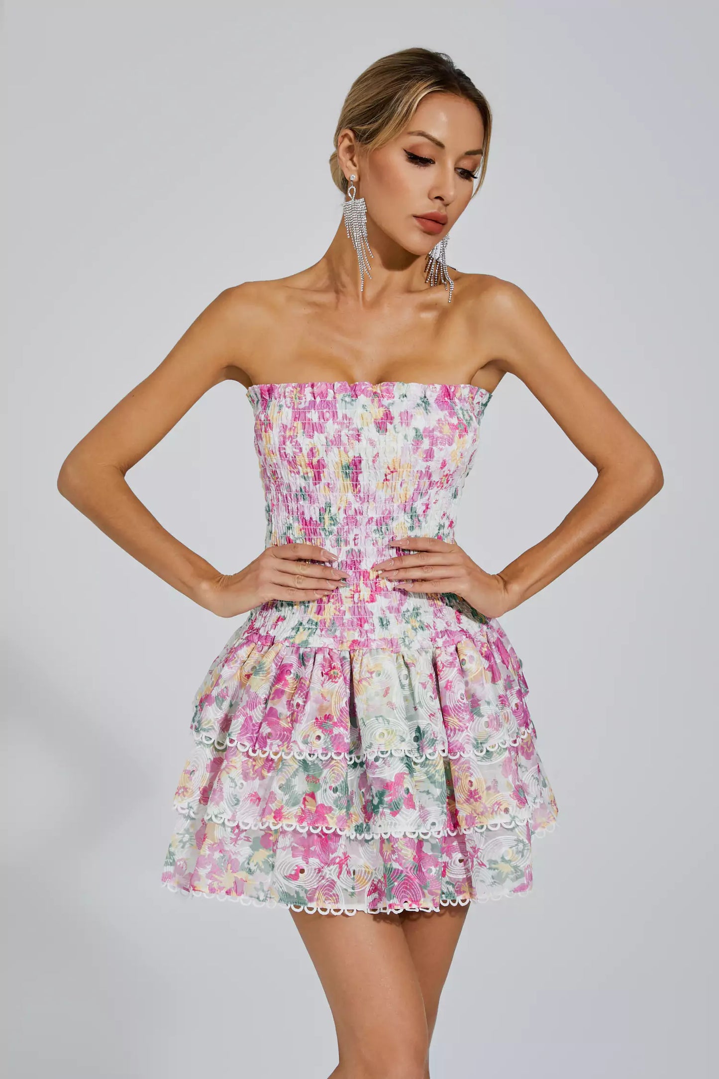 The Mercy White Floral Ruched Mini Dress exudes sweet style, perfect for the new spring season. With its trendy printed tube top and slimming design, this mini dress showcases elegance and charm. Embrace a fashionable and feminine look with this stunning dress.