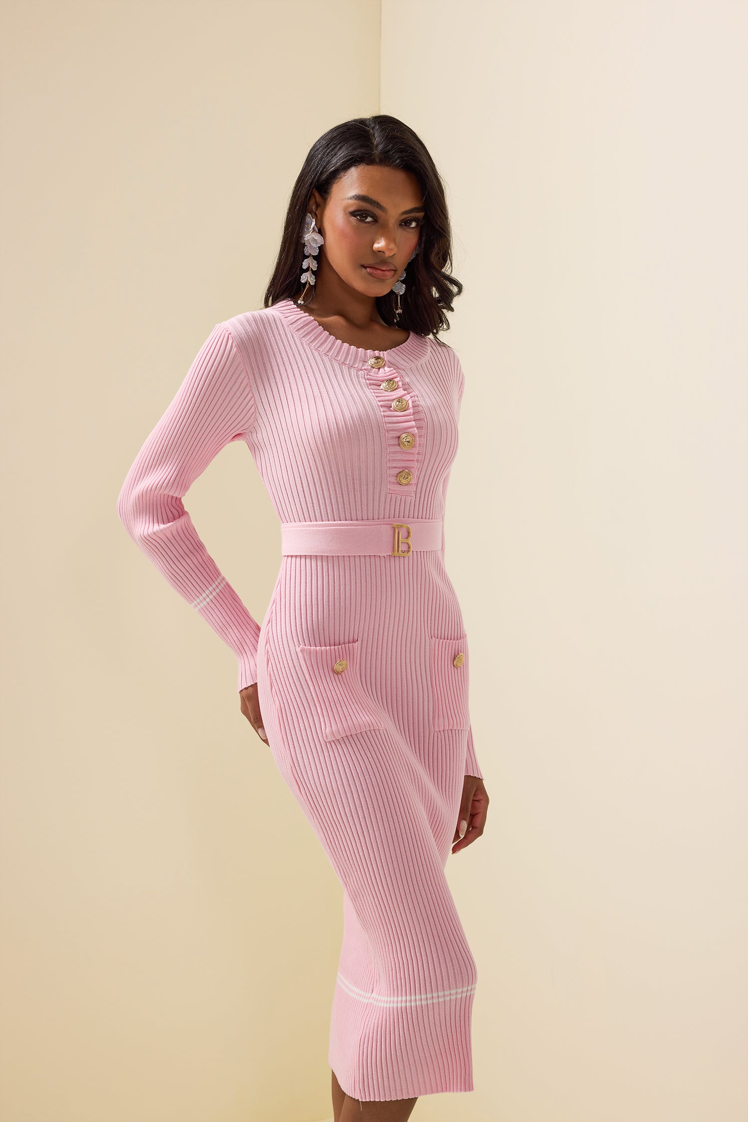 Metal Button Jersey Long Sleeve Midi Dress Pink