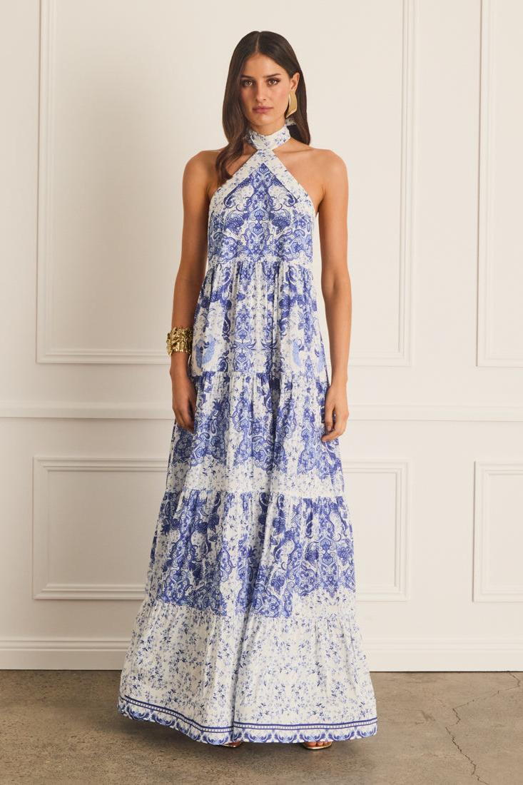 - Sleeveless, paisley print, blue, halter neck, backless, midi dress