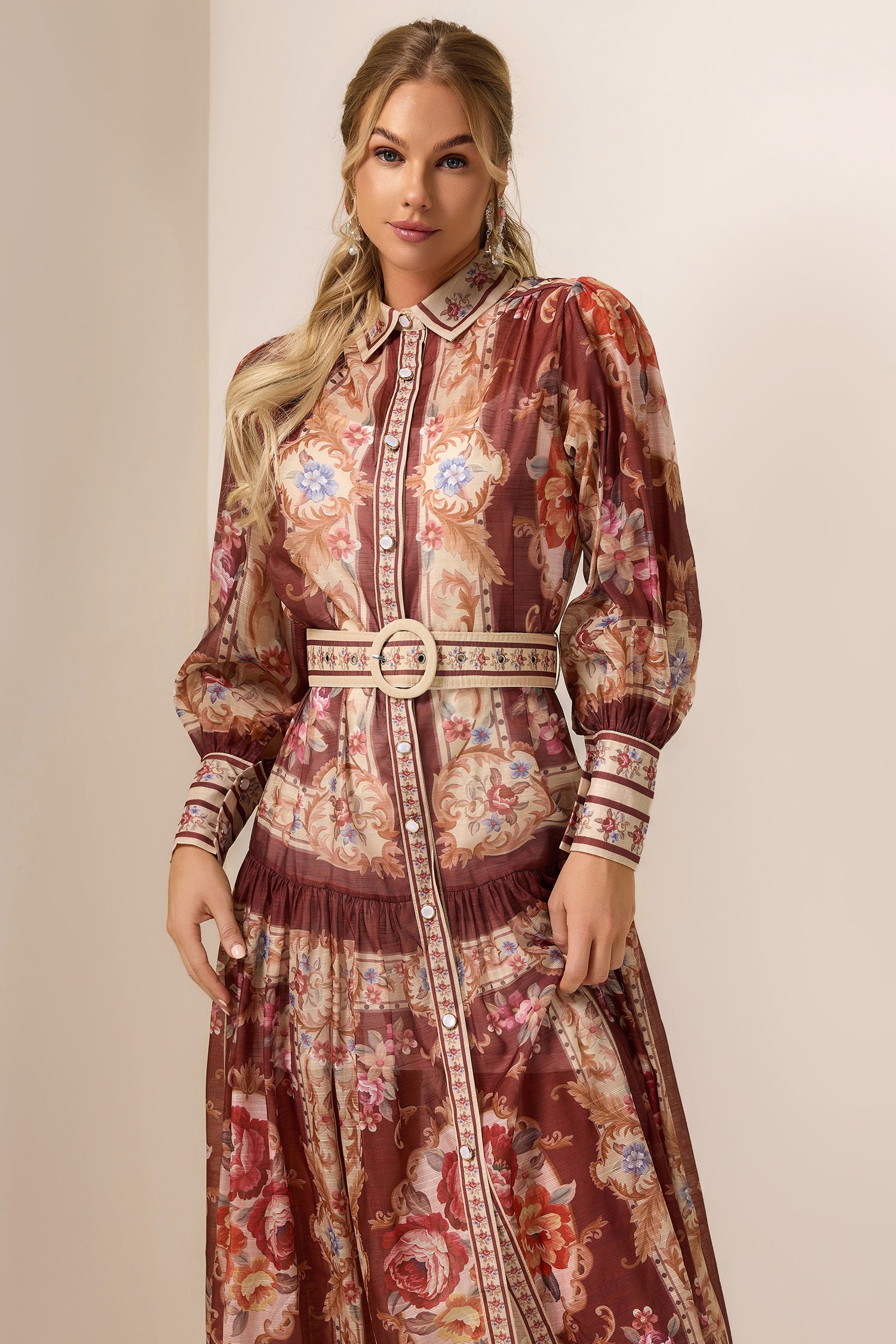 - Palace print, lantern sleeves, stand collar,brown, midi dress,
