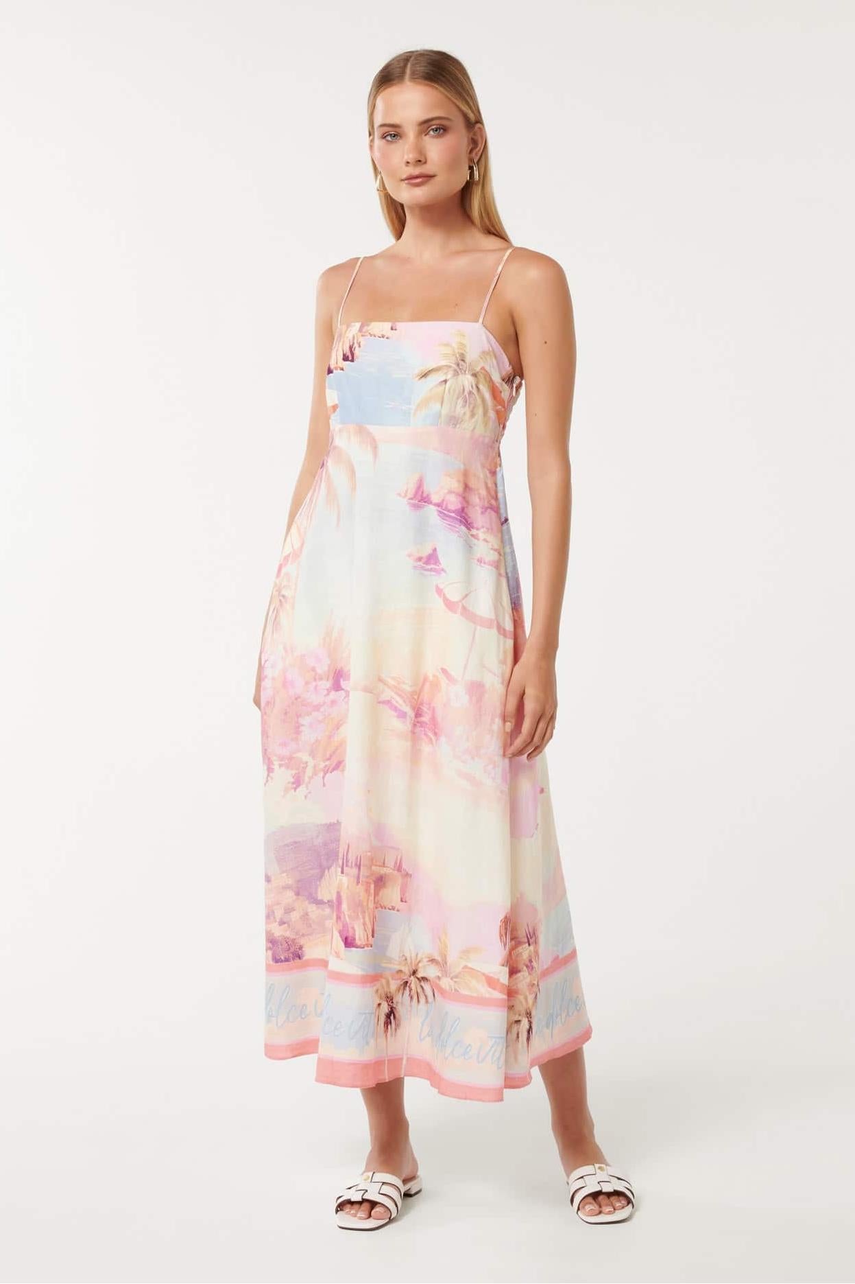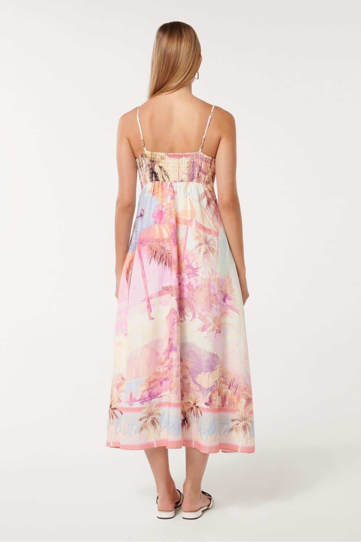 - Sleeveless, satin, smocking, floral printed, midi dress