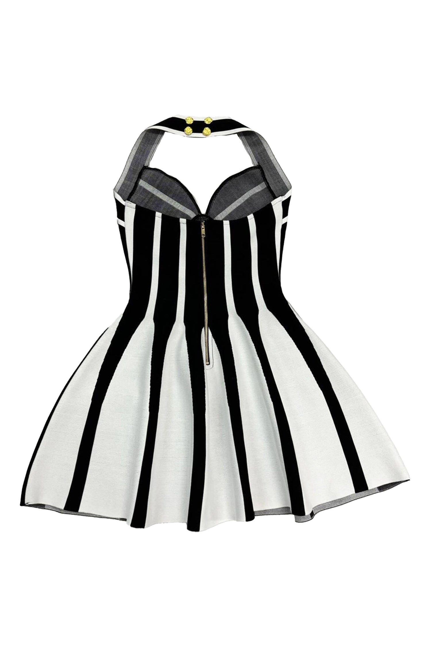The Smollett Black Striped Halter Dress features a striking black-and-white contrast with bold stripes, a sultry backless design, and a flattering halter neckline. Crafted from stretch knit fabric, it enhances curves while ensuring comfort for a chic, modern look.