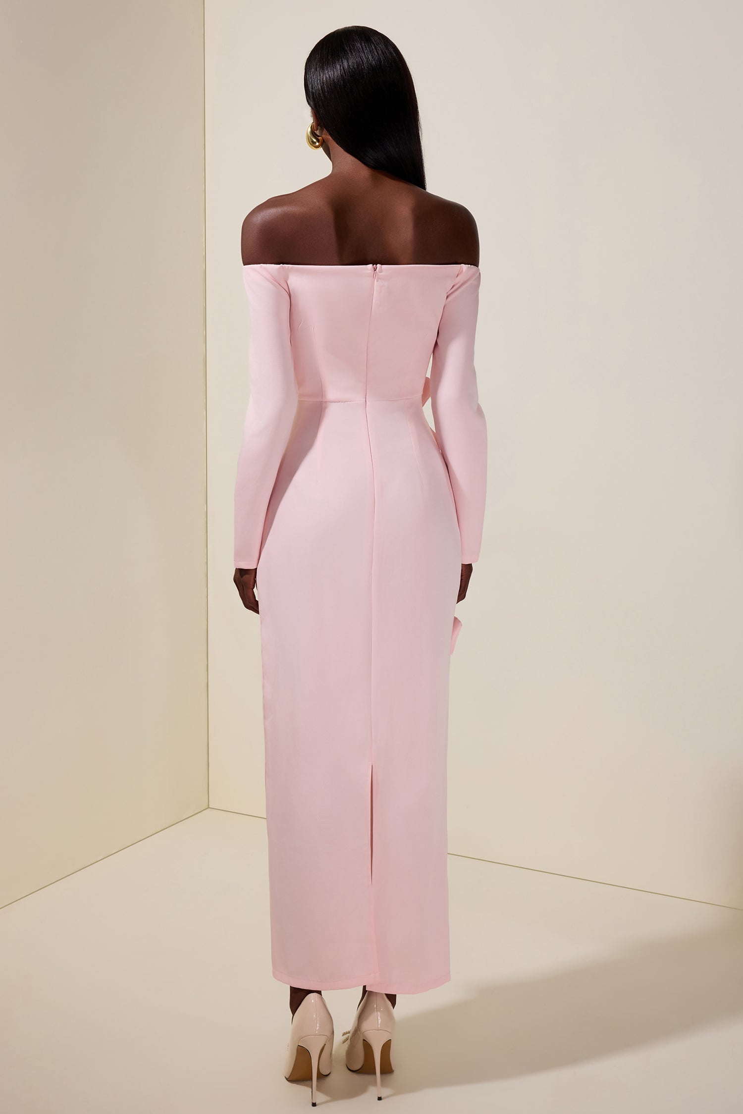 - Long sleeve, solid color, pink, 3D flower, off-shoulder, midi dress
