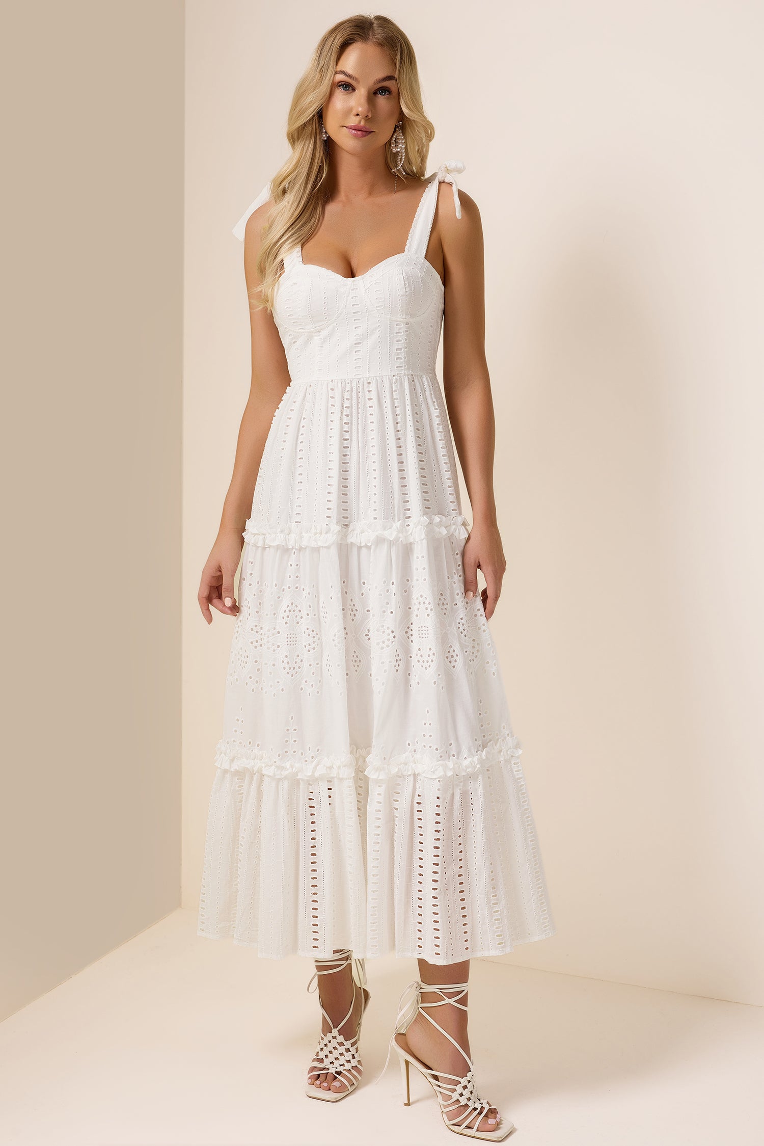 - Sleeveless, solid color, white, cut-out, frill, midi dress