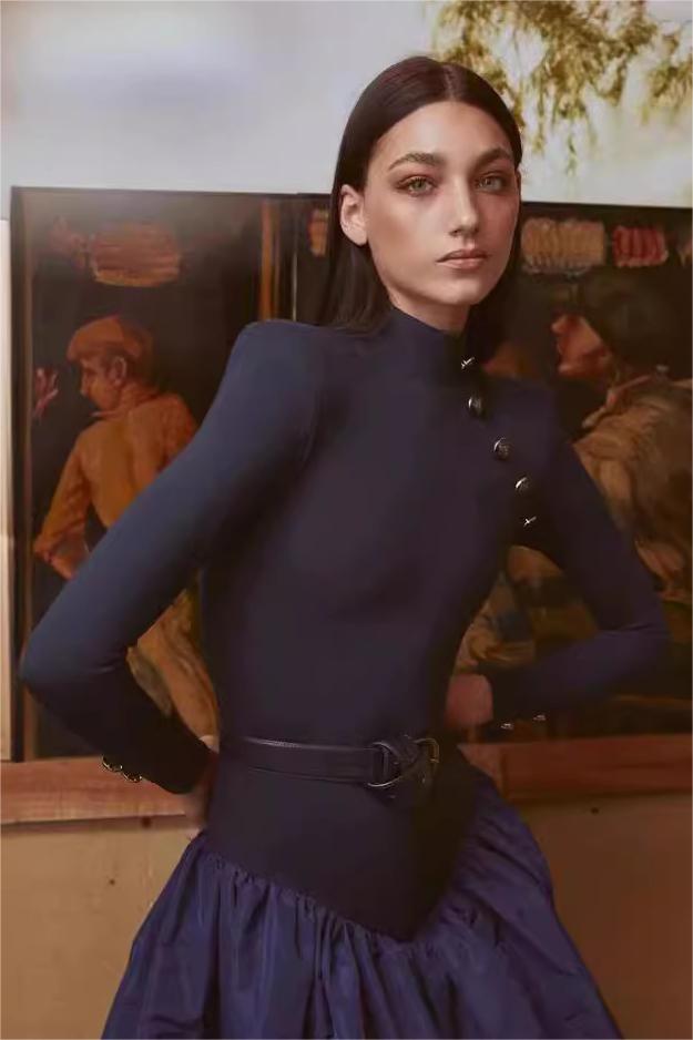 - Solid color, blue, high neck, button, midi dress, long sleeve
