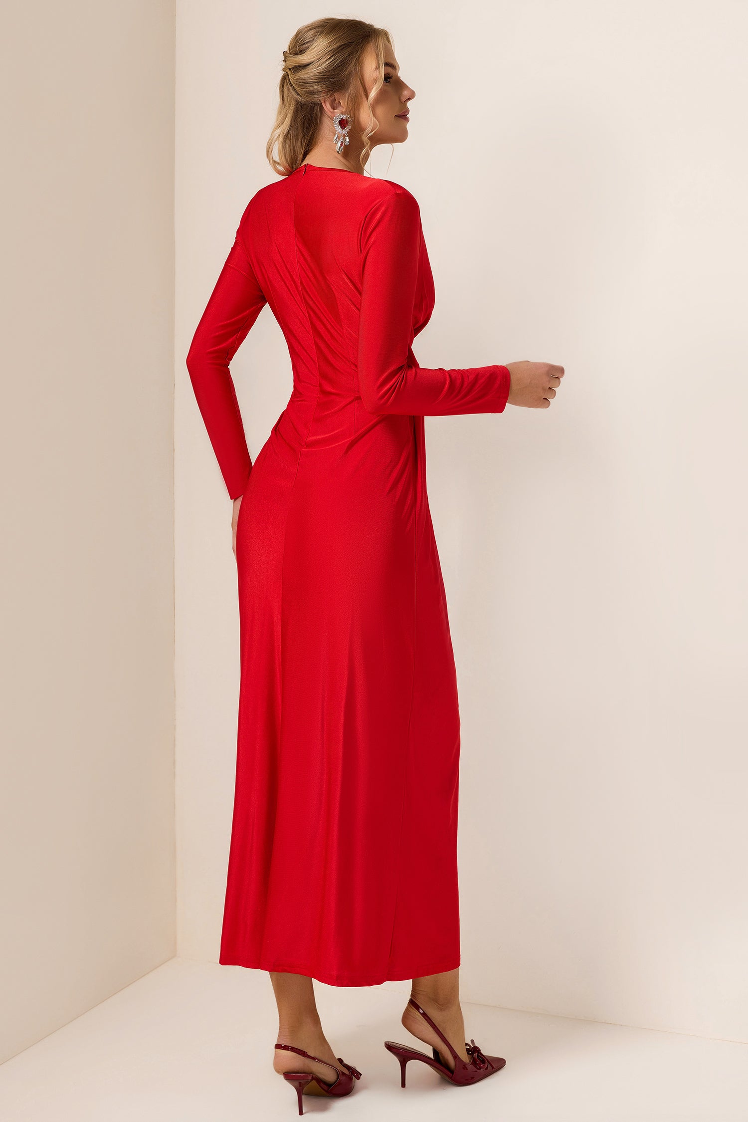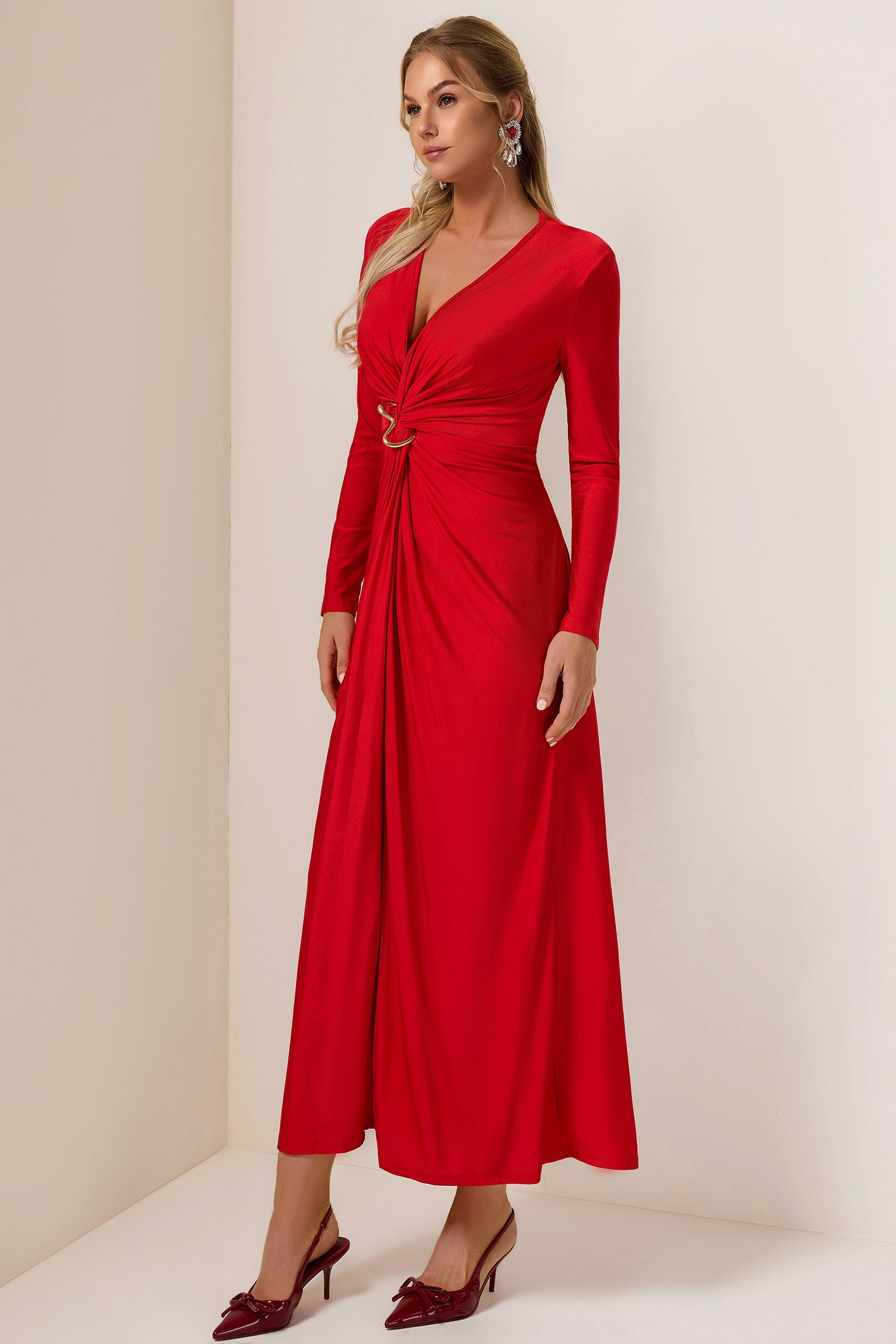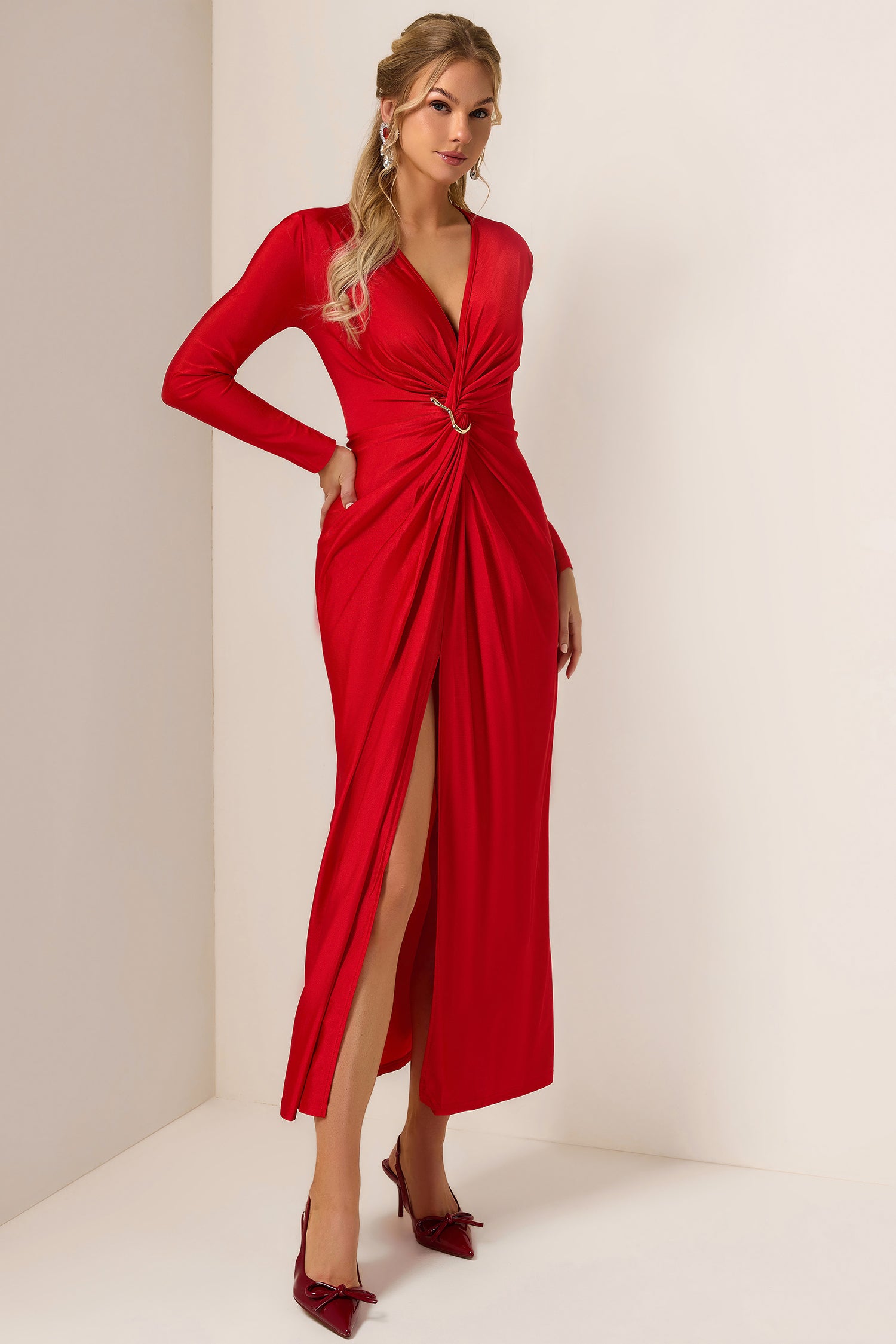 - solid color, red, long sleeves, midi dress, v-neck
