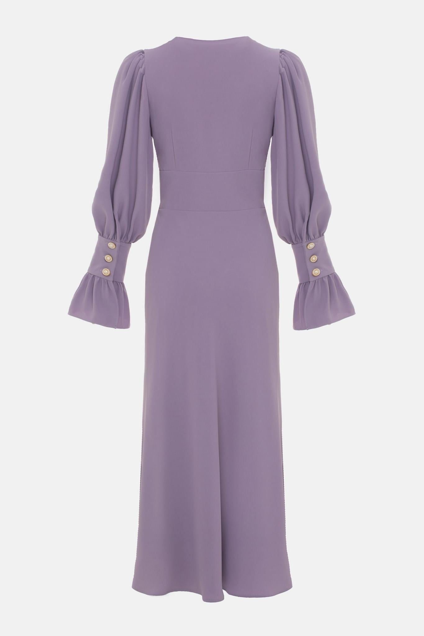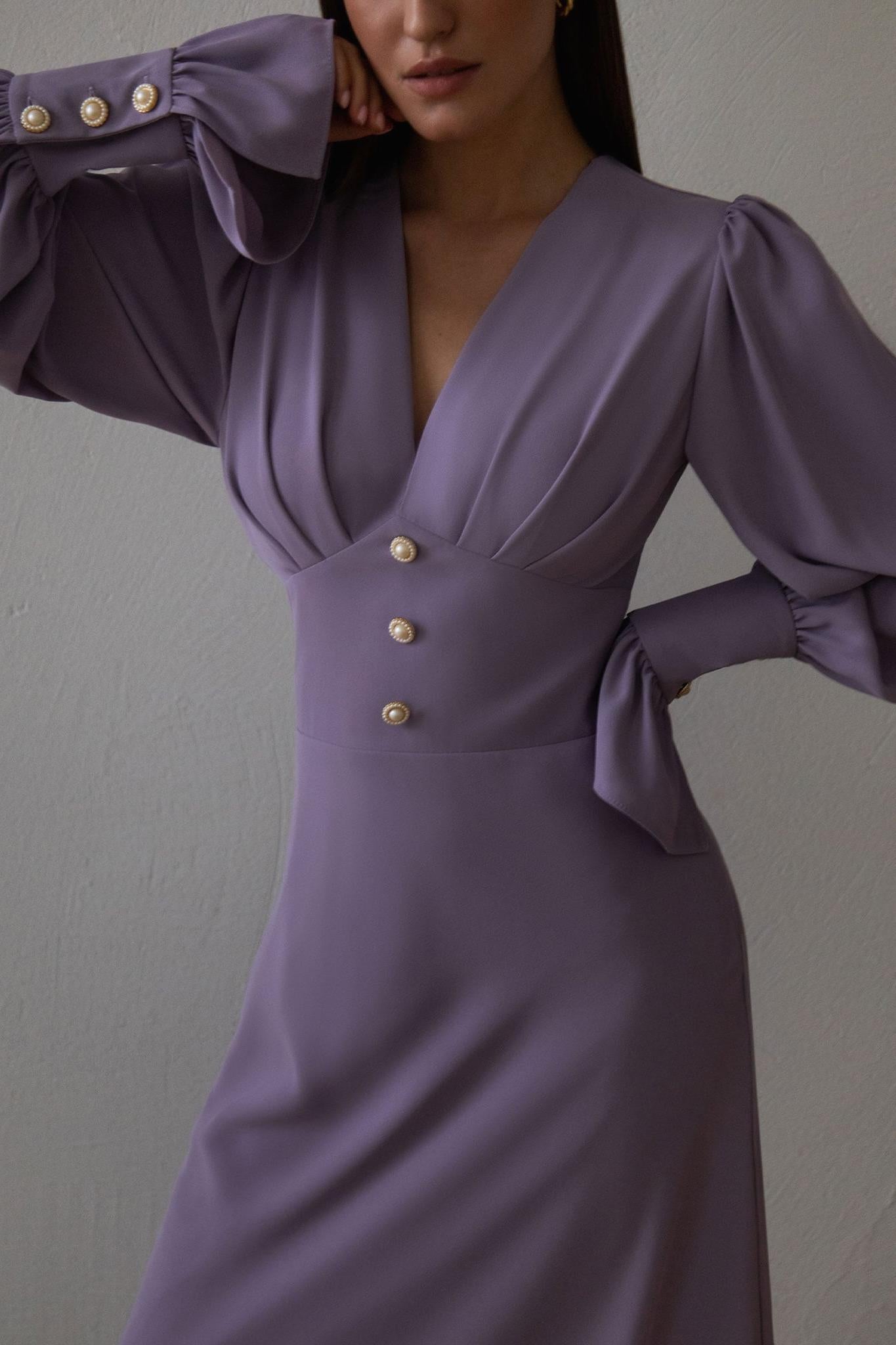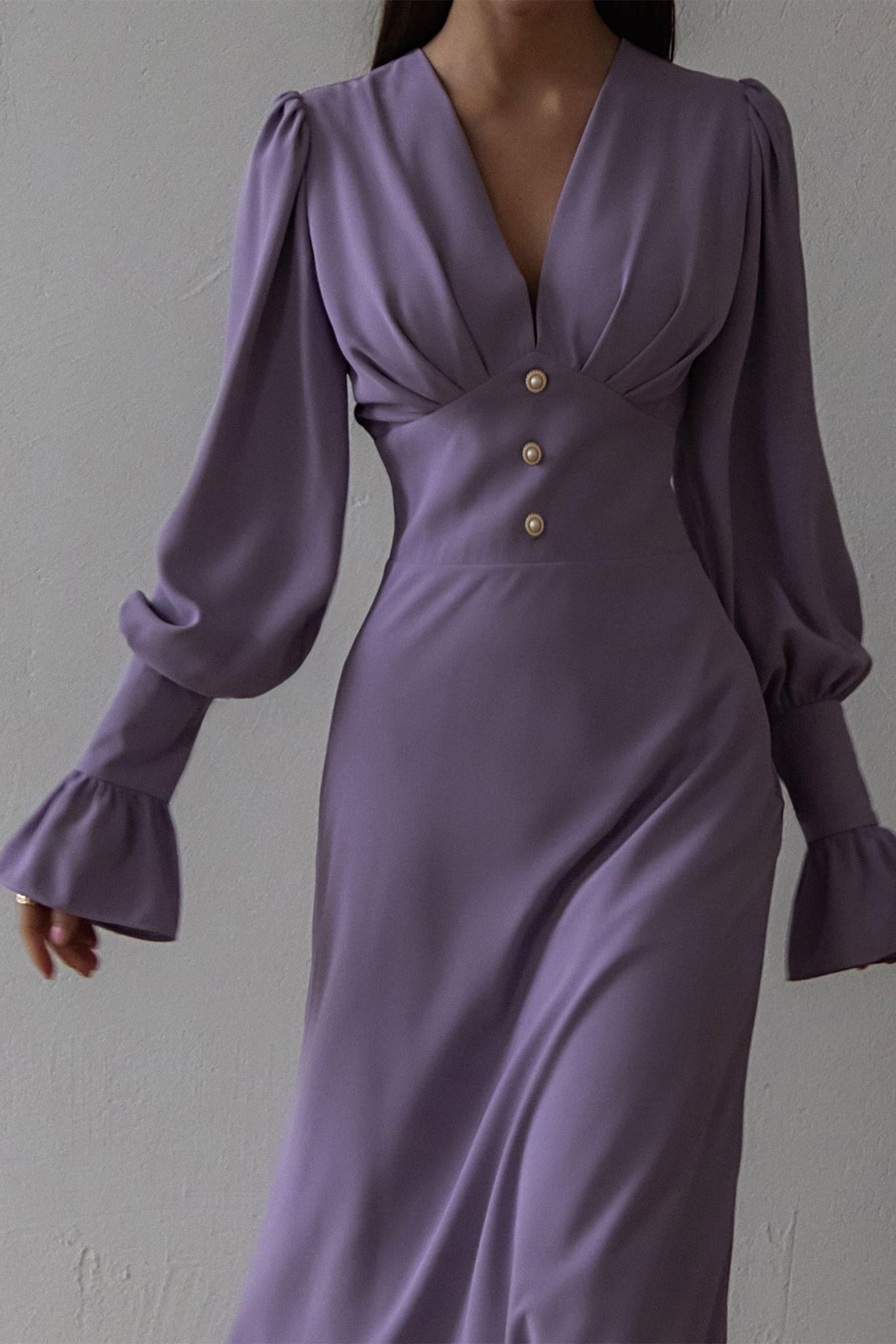Solid V-Neck Lantern Sleeve Midi Dress