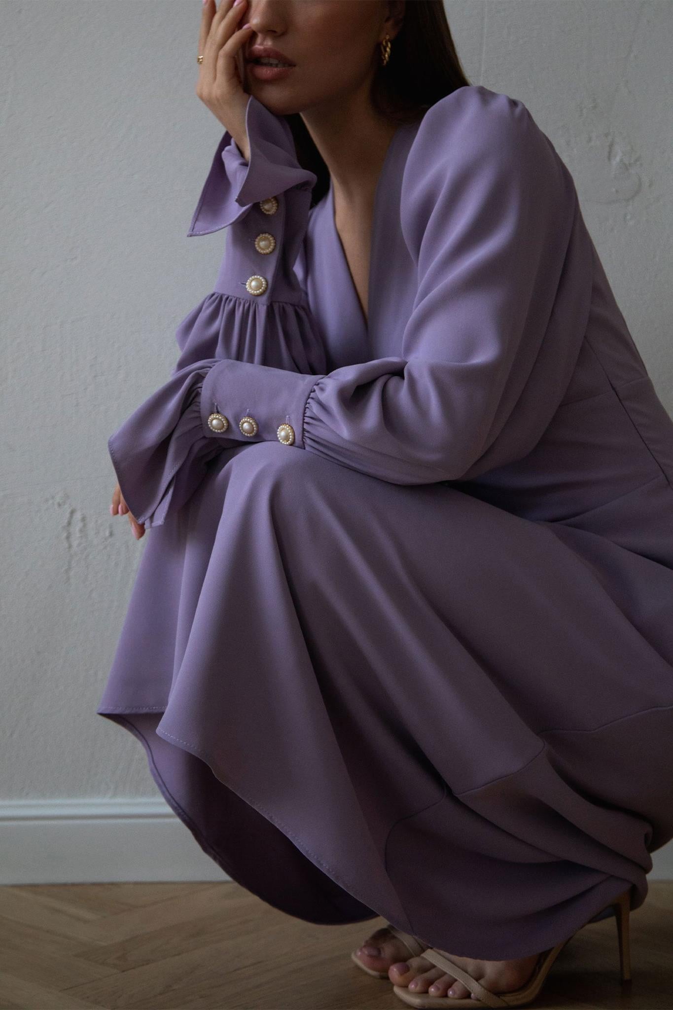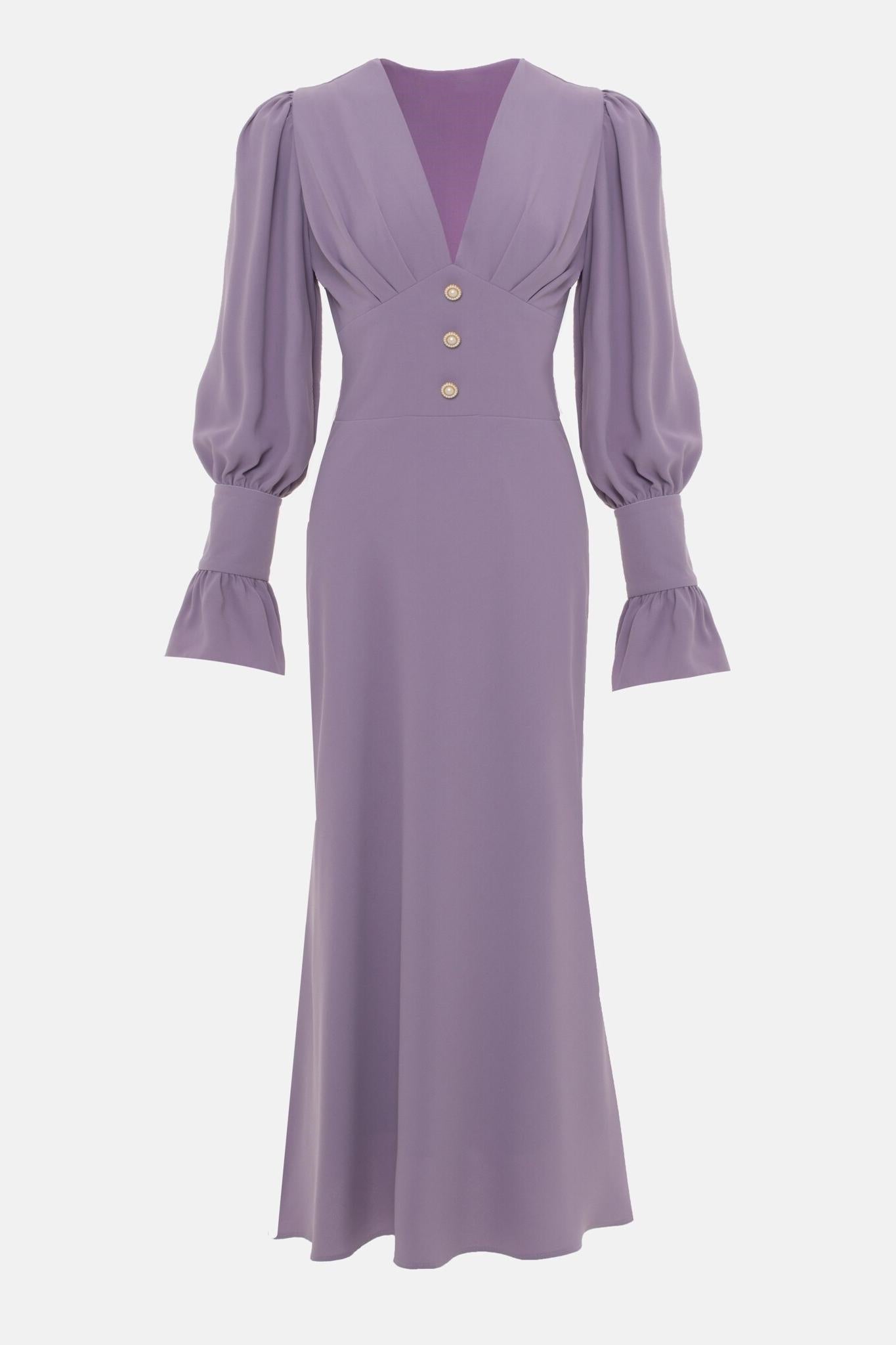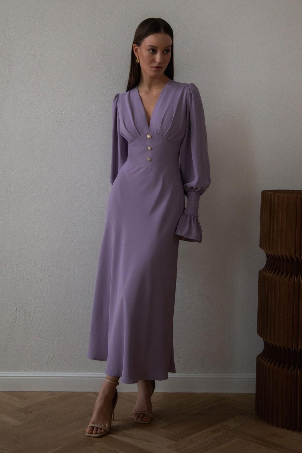 Solid V-Neck Lantern Sleeve Midi Dress