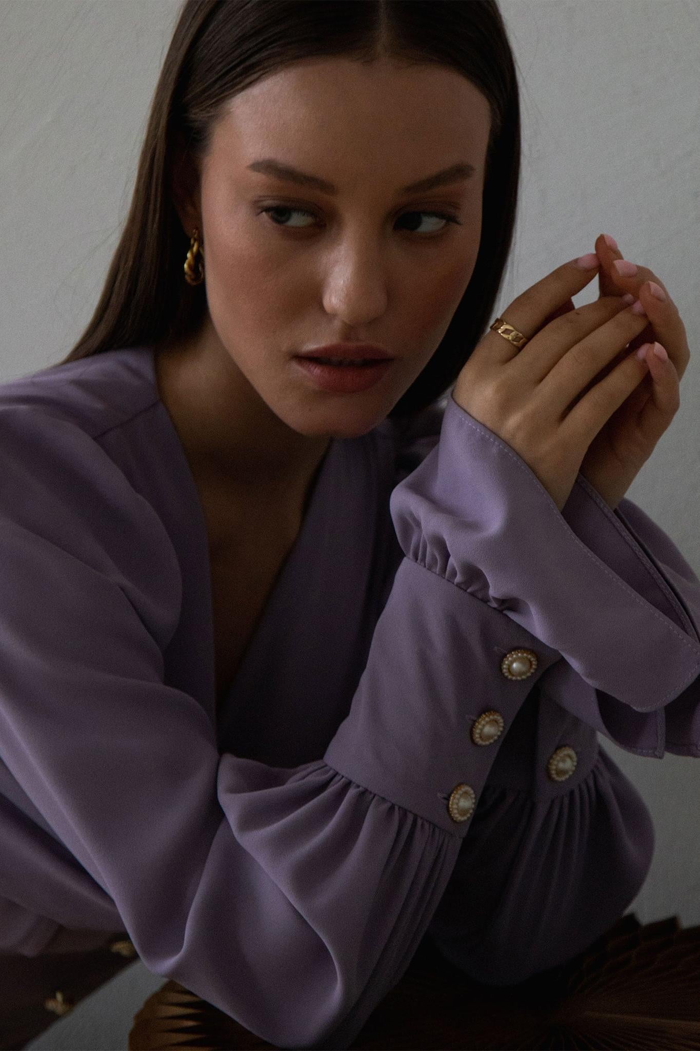 - Solid color, v-neck, lantern sleeve, long sleeve