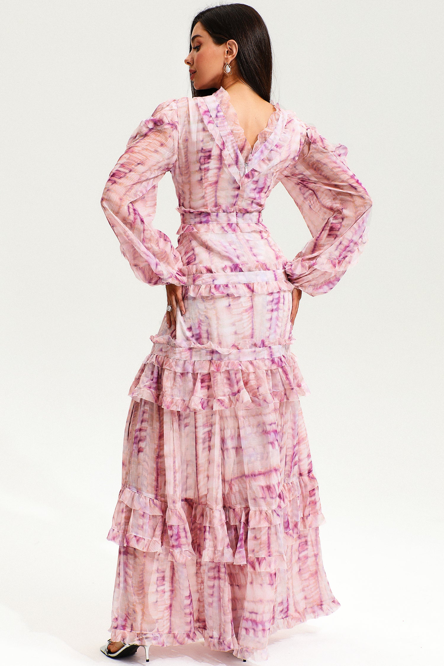 V-Neck Lace Puff Sleeve Tiered Ruffle Hem Maxi Dress Pink